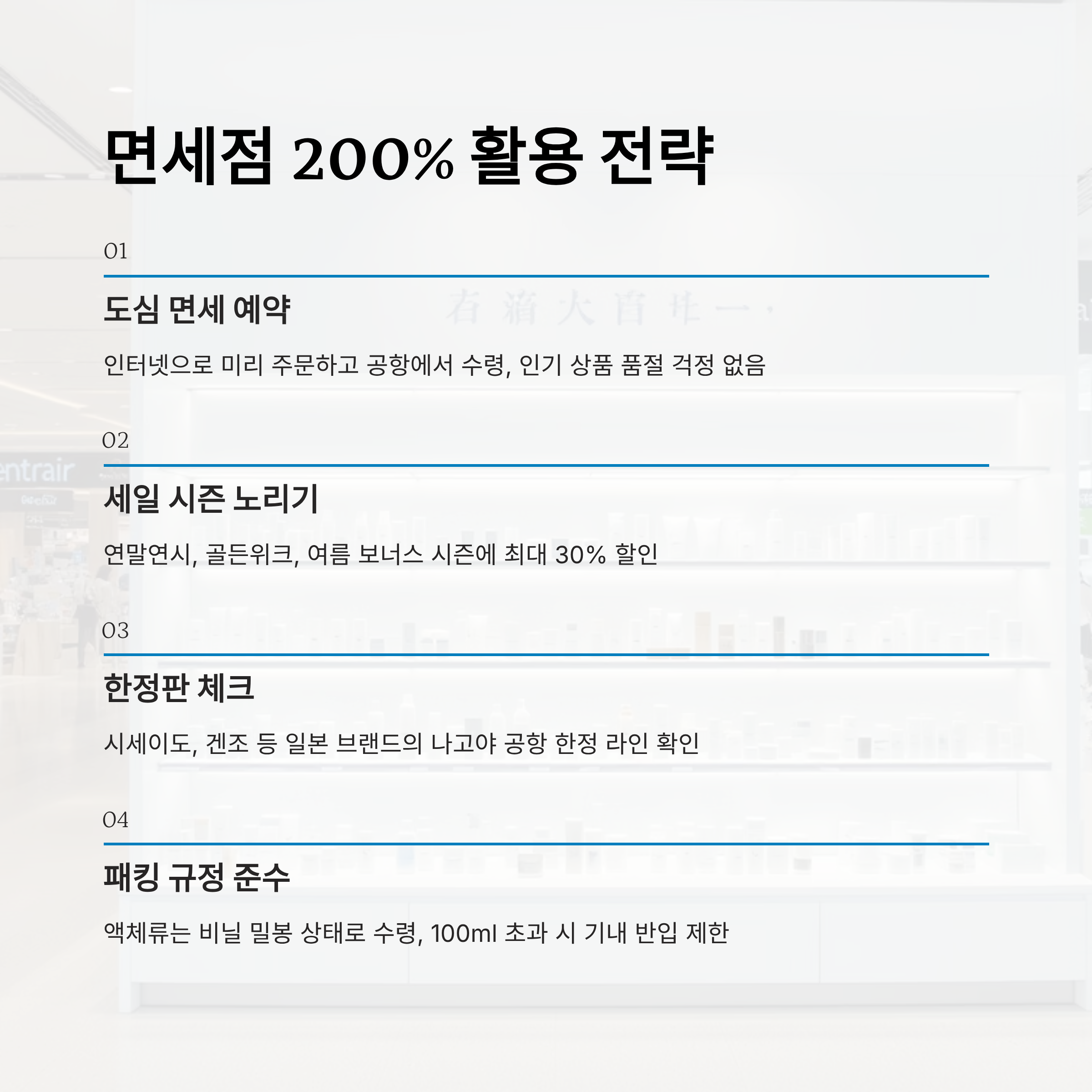 그리고 마지막 꿀팁은, 면세 쇼핑 후 상품은 반드시 기내로 반입할 수 있도록 ‘비닐 밀봉’ 상태로 수령해야 한다는 점이에요. 액체류는 100ml 넘으면 기내 반입이 제한되니, 공항 내 수령 시 반드시 규정에 맞는 포장 상태로 받으세요!✋