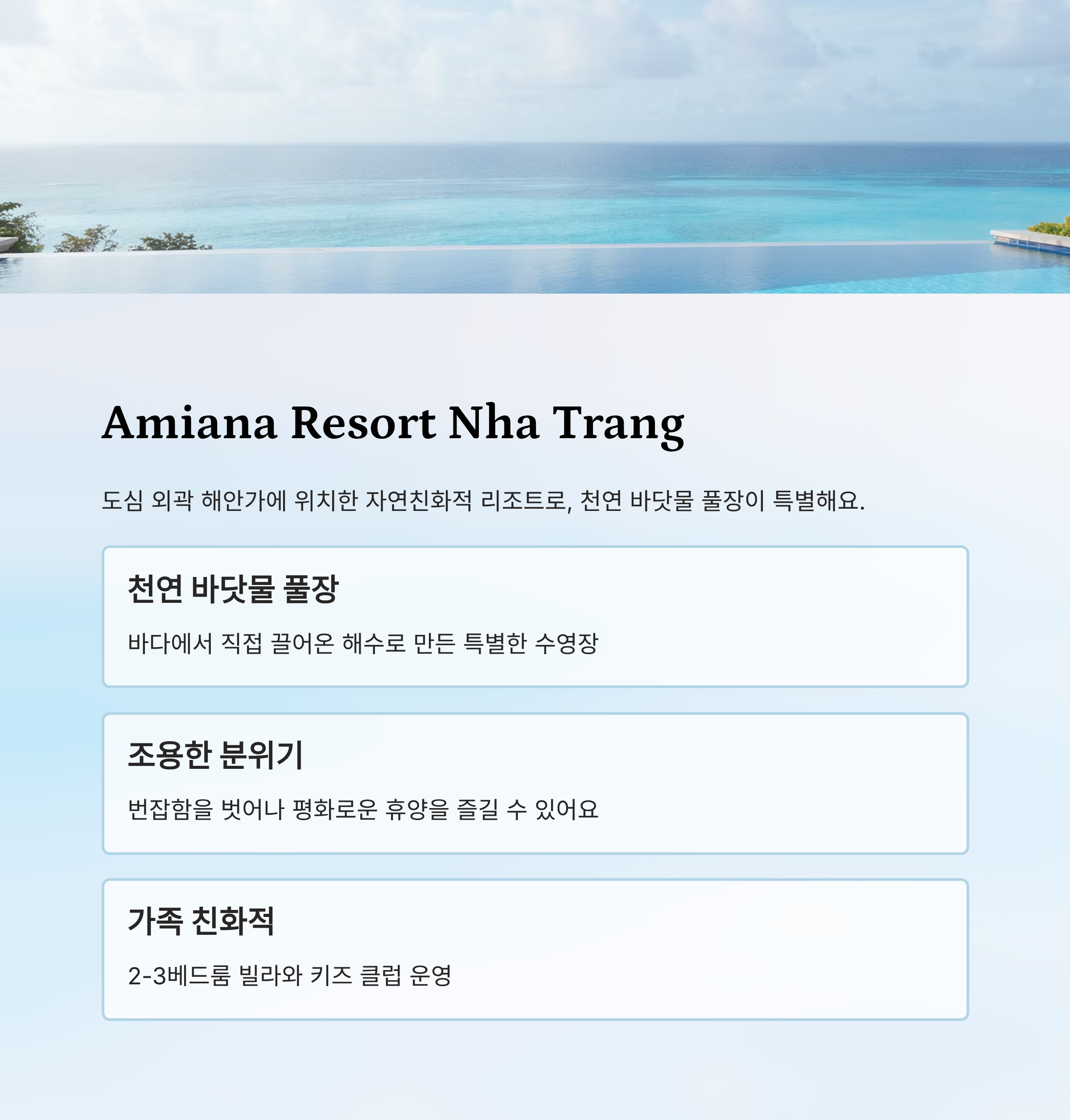 비교해 보면, Vinpearl은 올인원 럭셔리 휴양, Amiana는 조용한 자연 속 휴식, InterContinental은 도심 속 프리미엄 호텔이라는 포지션이 명확해요. 따라서 여행 목적과 동행인의 성격에 따라 선택이 달라져요.