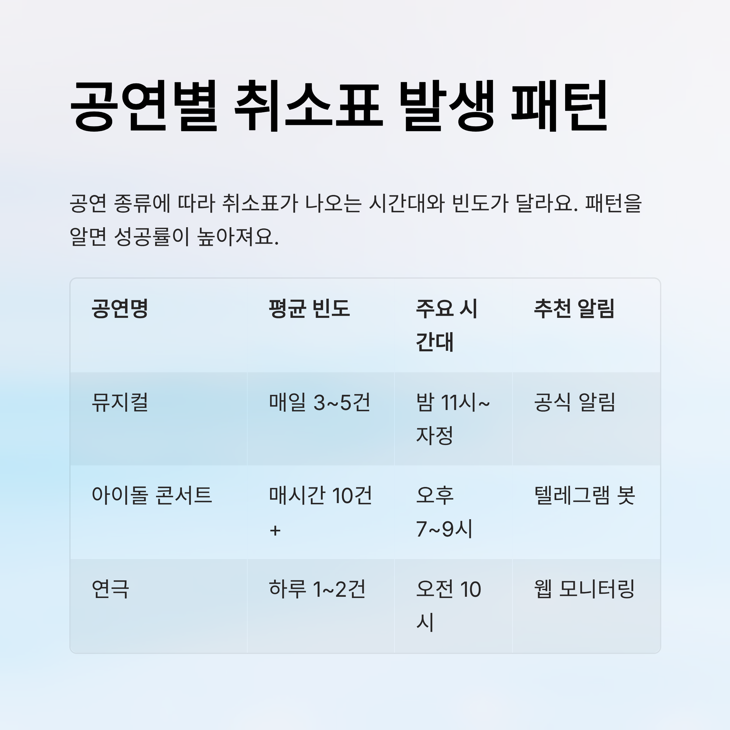| 공연명 | 평균 취소표 빈도 | 주요 시간대 | 예매 성공률 | 추천 알림 설정 |