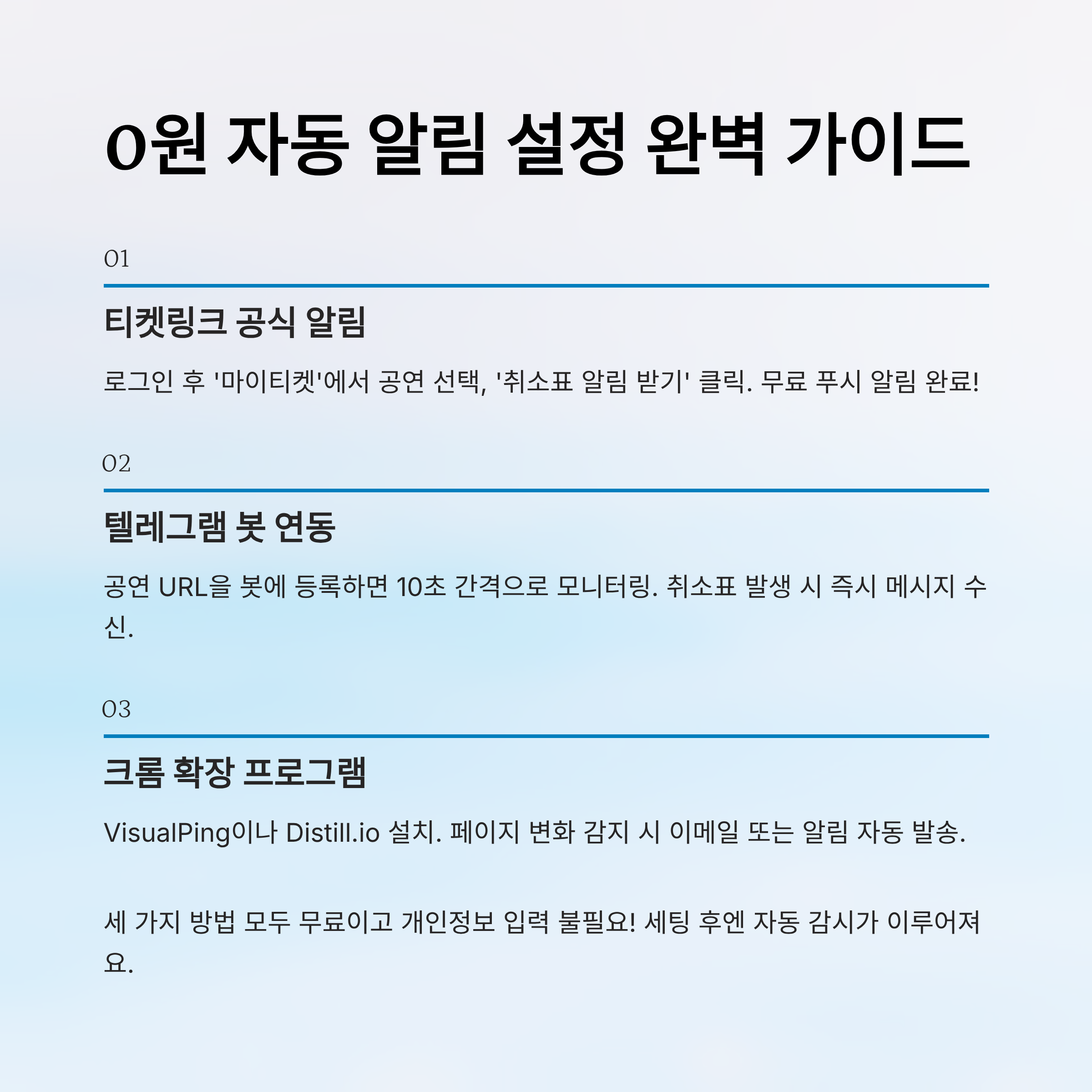 세 가지 방법 모두 무료로 활용 가능하고, 결제 정보나 개인정보 입력이 필요하지 않아요. 세팅 후엔 자동으로 감시가 이루어지기 때문에 시간 낭비 없이 취소표를 잡을 수 있답니다.👌