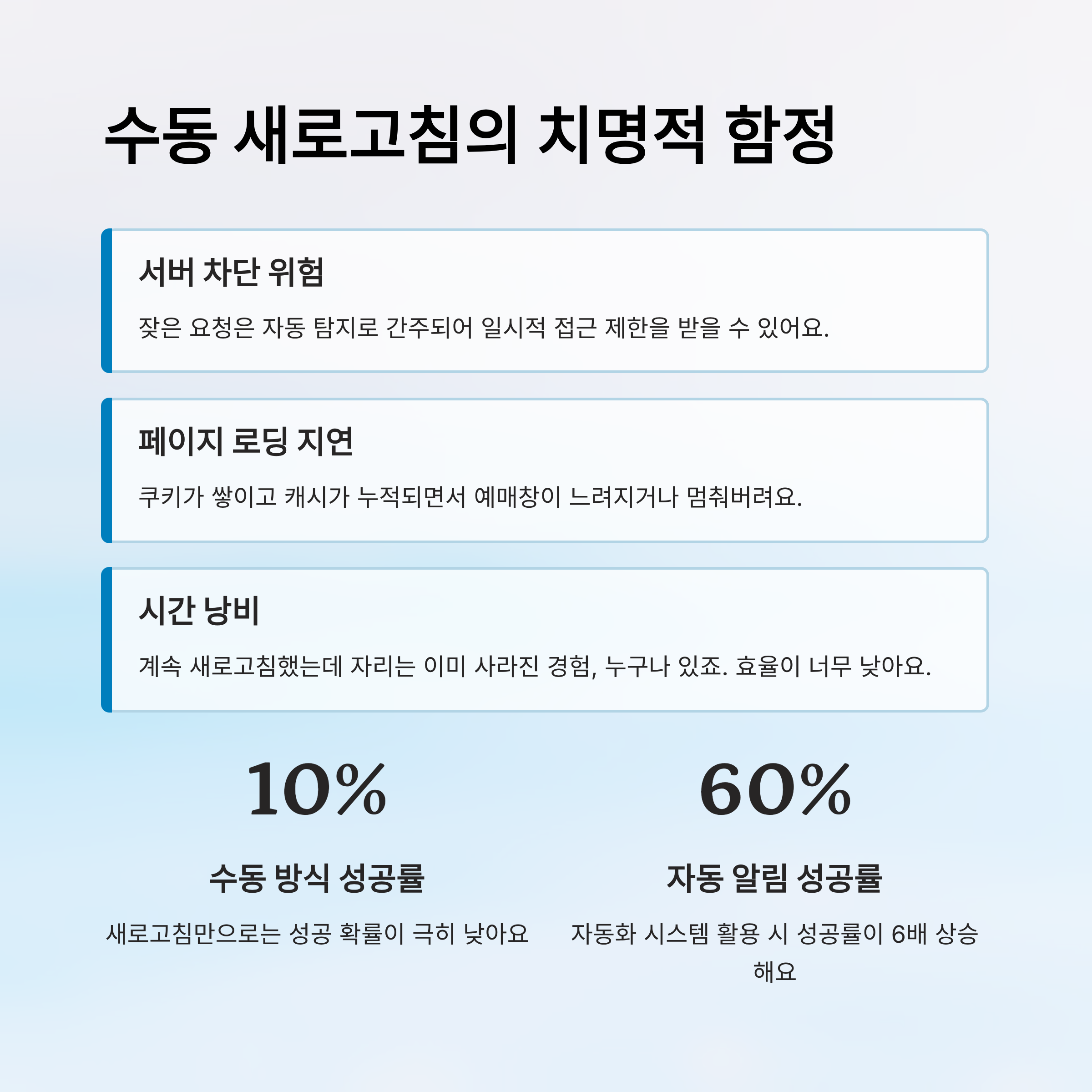 | 수동 새로고침 | 낮음 | 10% 미만 | 서버 차단 위험 | 비추천 |