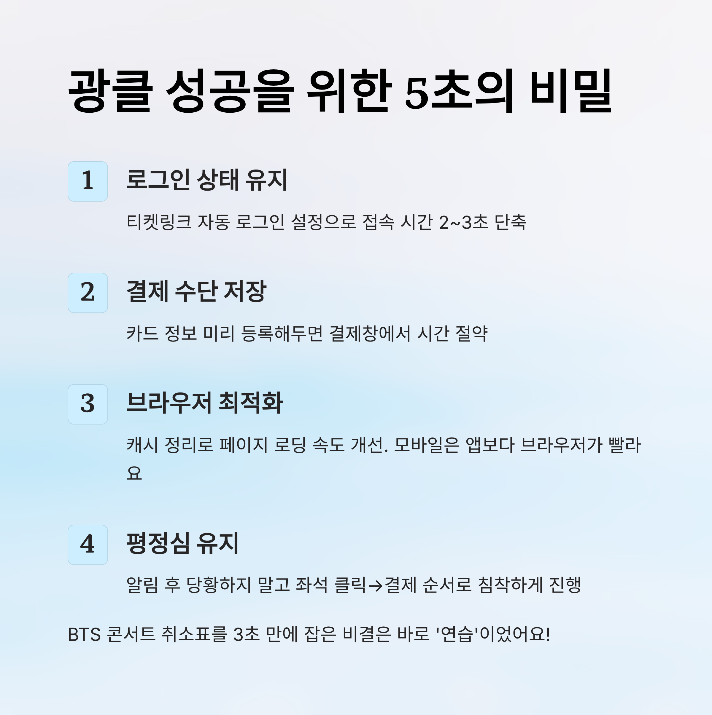 “광클 성공자”들의 공통점은 ‘손보다 마음의 준비’가 되어 있다는 점이에요. 알림이 울리면 당황하지 않고, 바로 지정된 좌석 클릭 → 결제 순서로 일사천리로 진행해요. 초조함보다는 평정심이 승부를 가르는 경우가 많아요. 실제로 한 팬은 BTS 콘서트 취소표를 텔레그램 알림으로 받아 3초 만에 예매 성공했다고 해요. 그 비결은 ‘연습’이었대요!