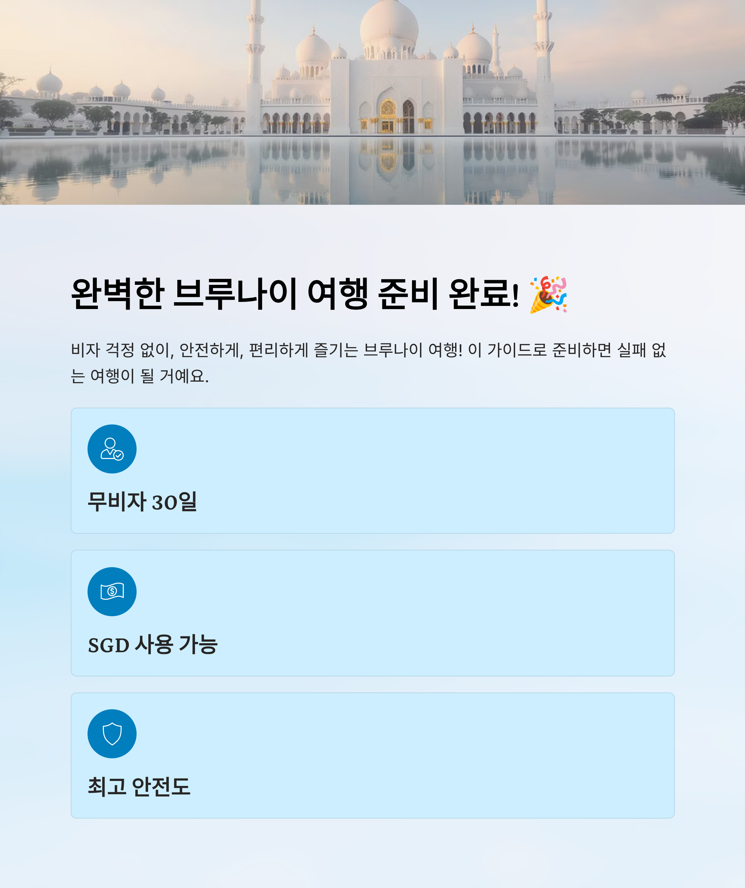 결론적으로, 30일 무비자 입국 가능, 여권 유효기간 6개월 이상, 금지물품 반입 주의 세 가지만 기억하면 브루나이 입국은 문제 없어요!