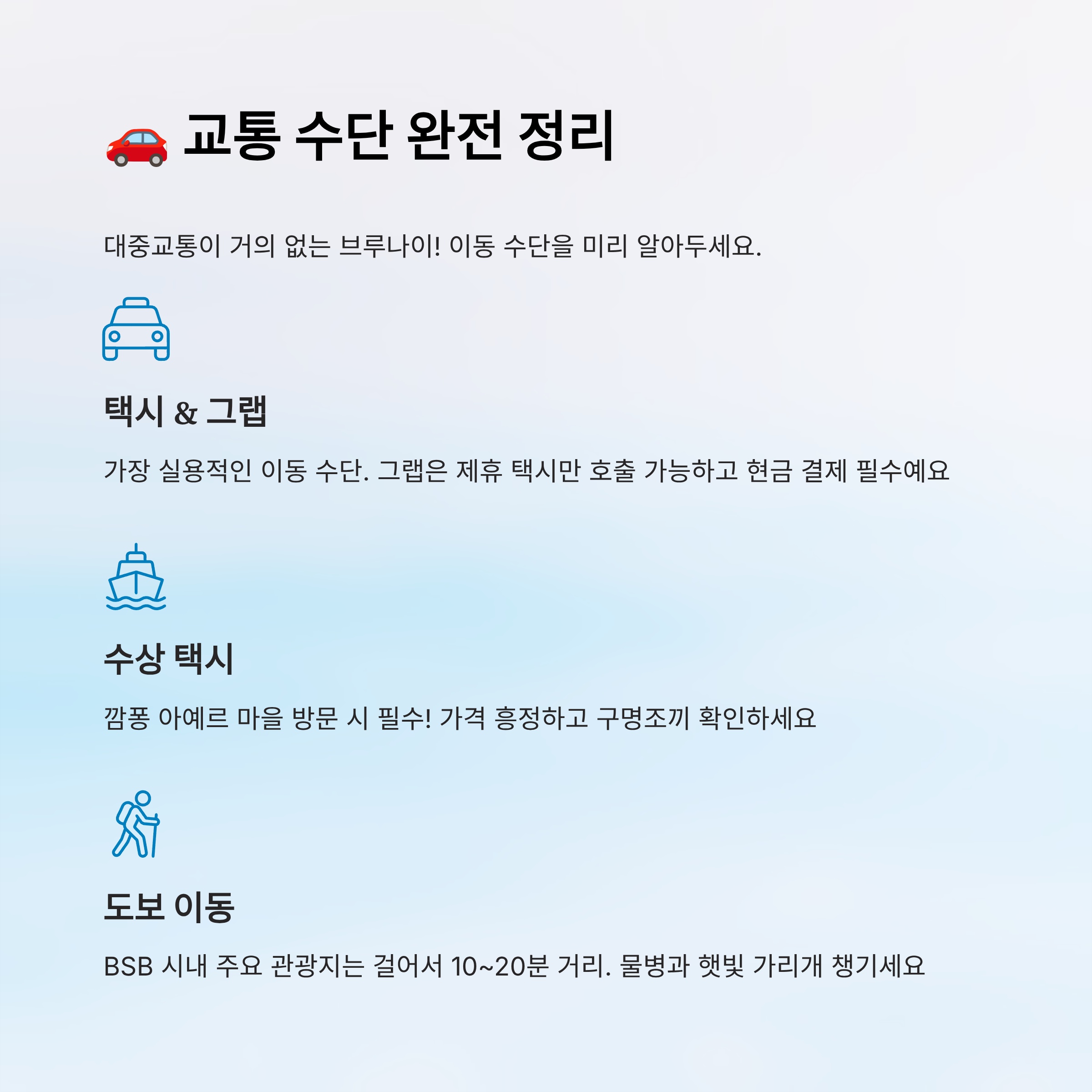 브루나이는 동남아시아 국가 중에서도 교통 인프라가 꽤 독특한 나라예요. 대중교통이 거의 없고, 시민들도 대부분 자가용을 이용하기 때문에 여행자 입장에서는 교통이 약간 불편하게 느껴질 수 있어요. 하지만 몇 가지 옵션만 잘 알아두면 여행도 어렵지 않답니다!