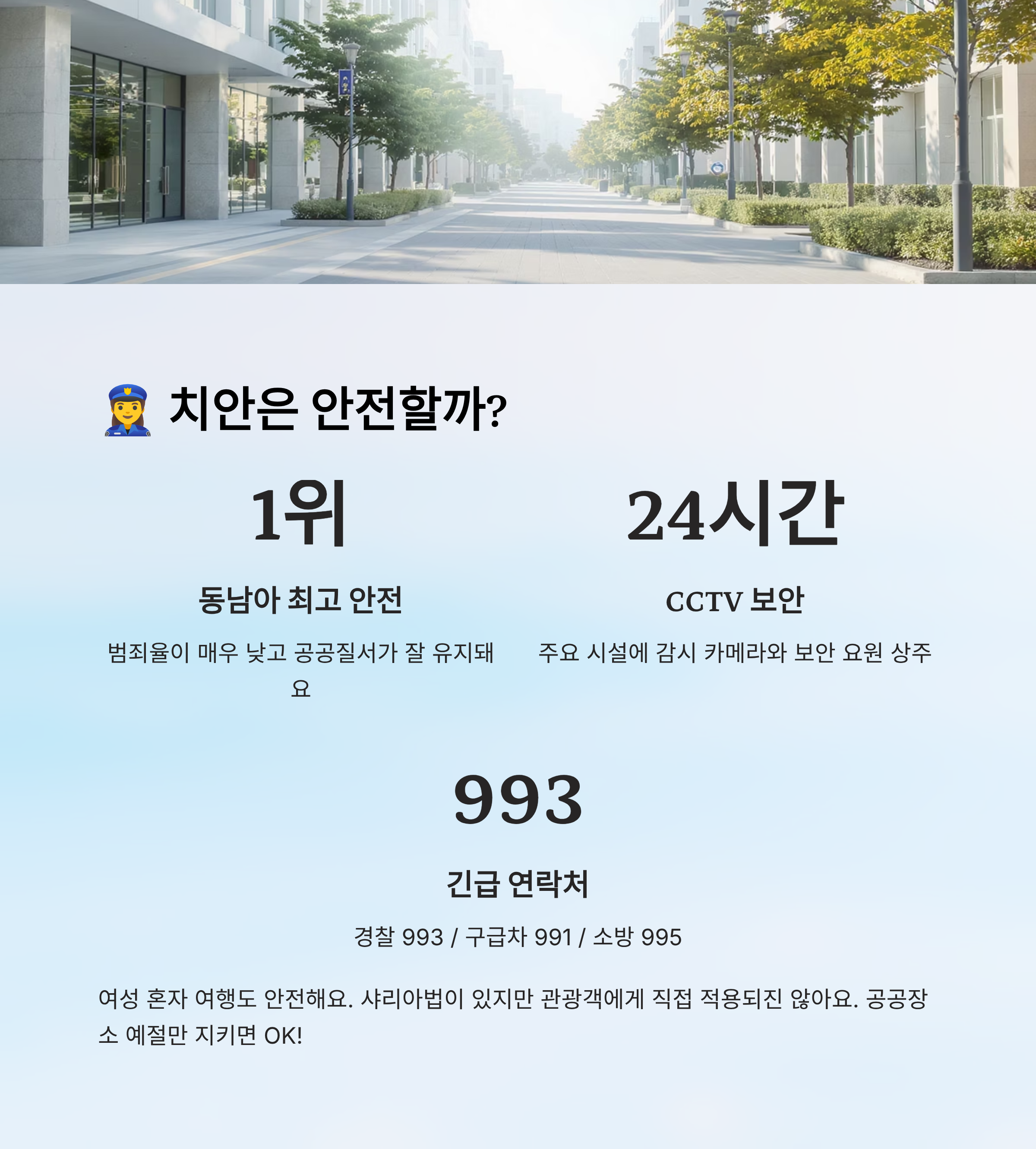 호텔과 쇼핑몰, 관광지에는 24시간 CCTV가 설치되어 있고, 보안 요원이 상주하는 곳도 많아요. 도난이나 위험한 상황이 발생했을 때 빠르게 대응할 수 있어서 안심할 수 있어요.