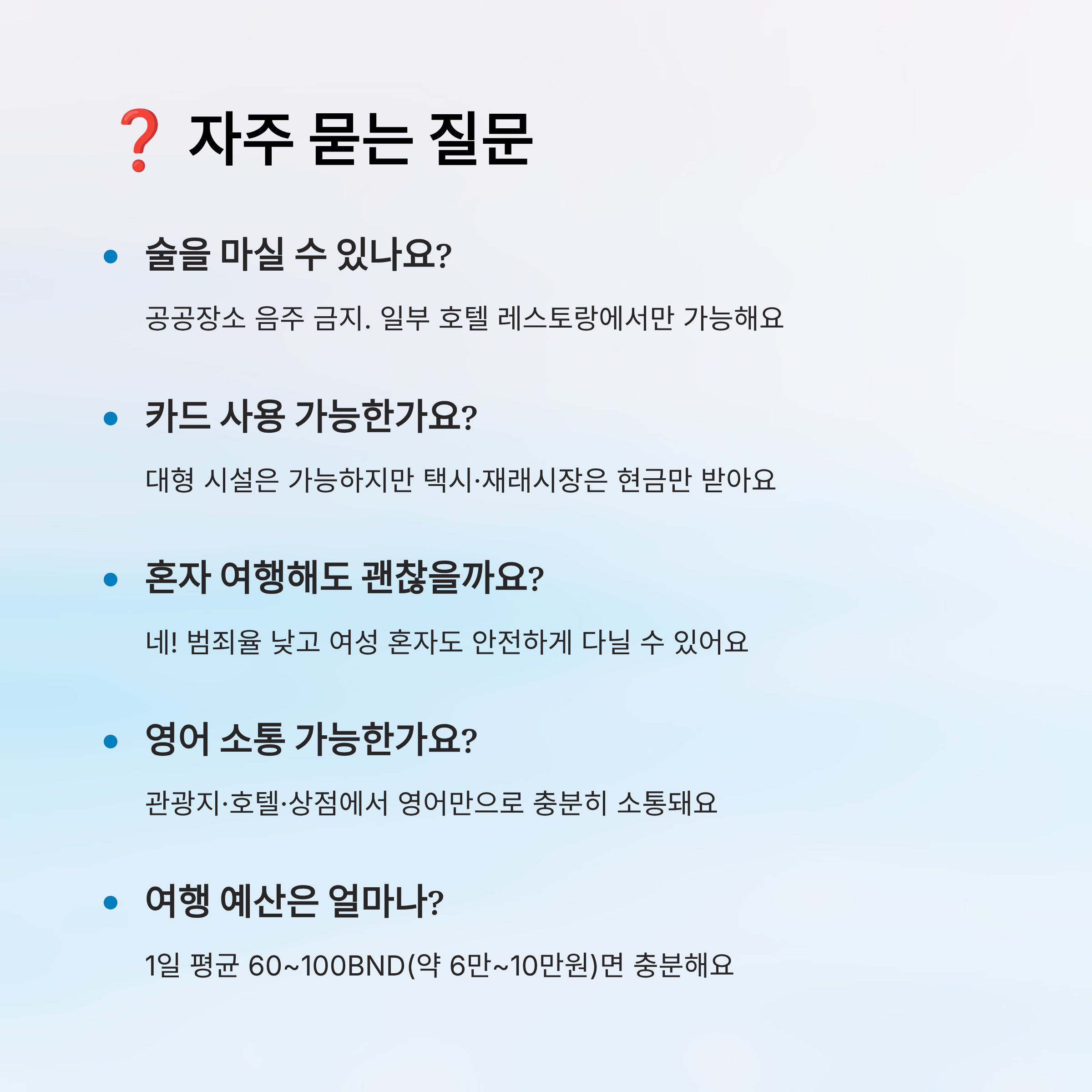 A5. 브루나이는 동남아시아 중에서는 물가가 조금 높은 편이에요. 1일 평균 60~100BND(약 6만~10만원) 정도면 숙박, 식사, 교통 모두 커버 가능해요.