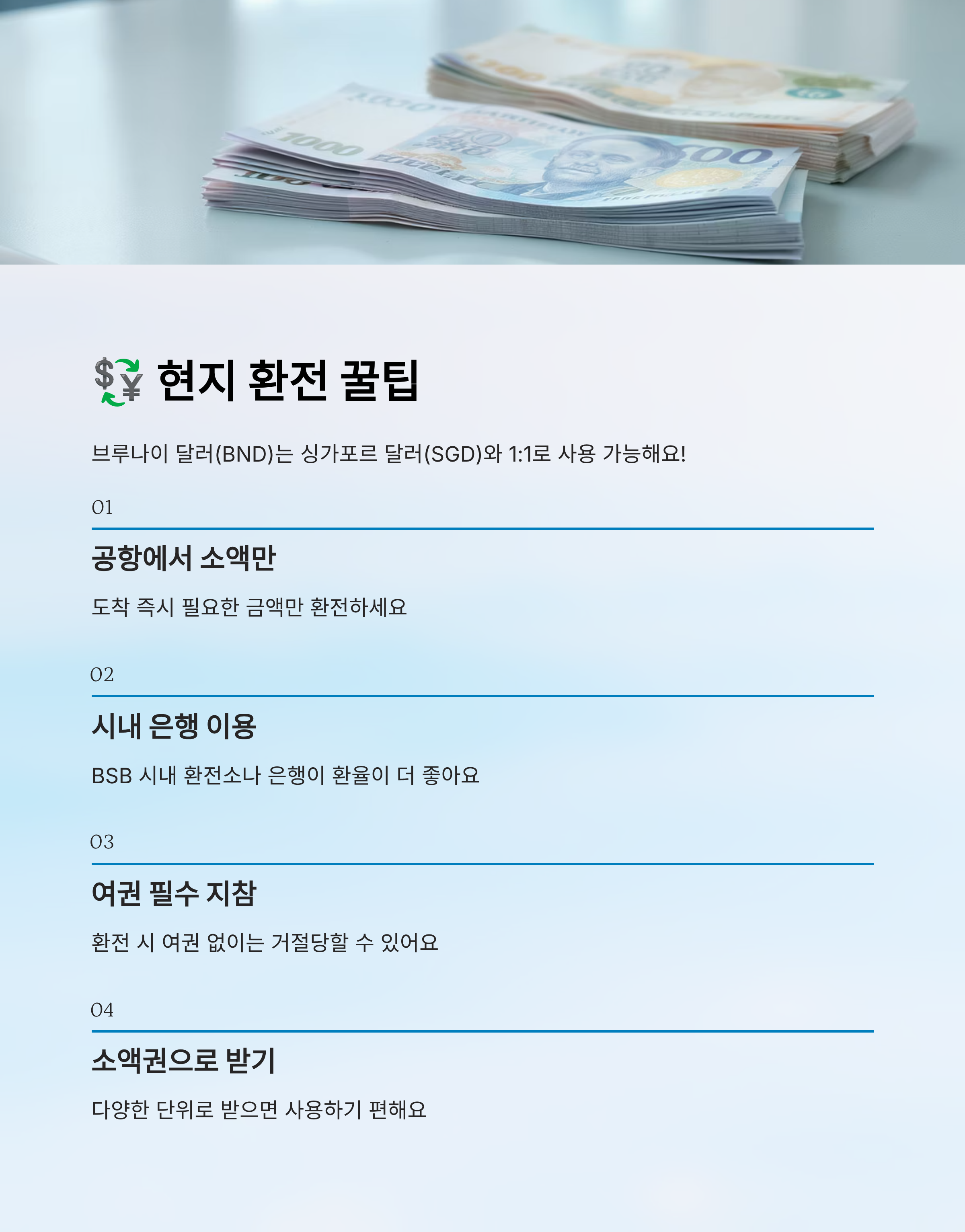 한국에서는 BND 환전이 어렵기 때문에, 대부분 싱가포르 달러(SGD)를 가져가서 현지에서 사용하거나 필요한 만큼 BND로 교환하는 방식으로 여행을 해요. 싱가포르에서 브루나이로 이동하는 경우, 굳이 환전을 하지 않아도 불편함이 없을 정도예요.