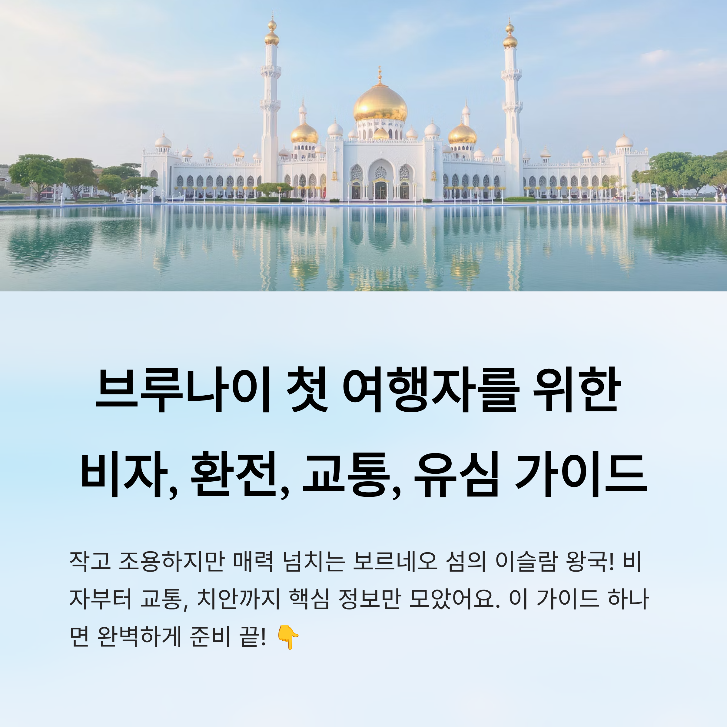 그래서 오늘은 브루나이를 처음 방문하는 분들을 위해 꼭 필요한 핵심 정보들만 모아봤어요! 비자부터 환전, 교통, 유심, 치안, 날씨까지 전부 담았으니, 이 글 하나면 완벽하게 준비할 수 있을 거예요. ‘브루나이 초보? 이거면 끝!’이라는 마음으로 천천히 따라와 주세요 😉