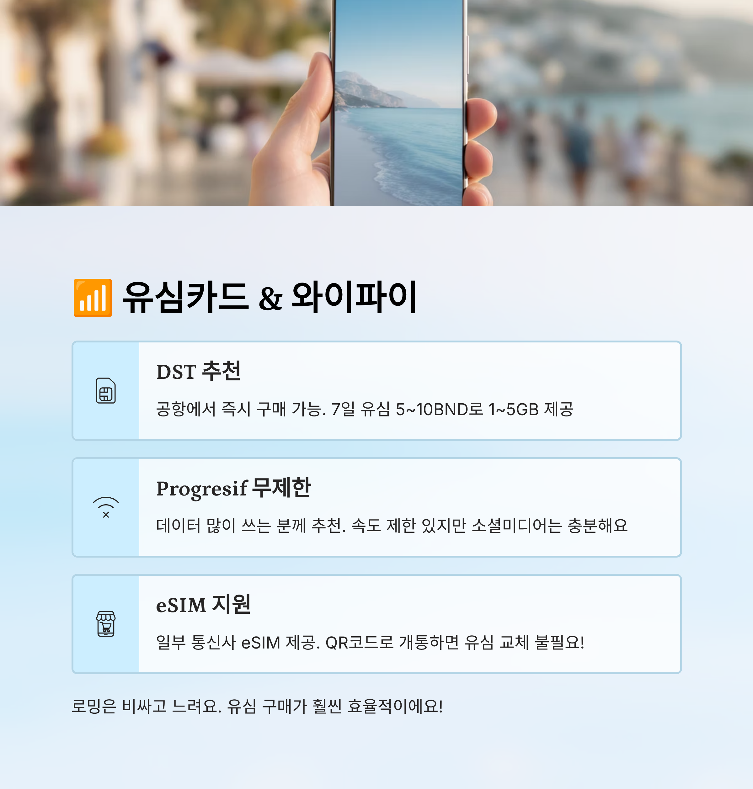 종합하면, 브루나이에서 인터넷 사용은 유심 하나면 충분해요. DST 또는 Progresif의 유심을 공항에서 바로 구매해서 사용하면 빠르고 안정적인 데이터 연결이 가능하답니다. 여행 중 구글지도, 인스타그램, 카톡 모두 문제 없이 잘 돼요 👍
