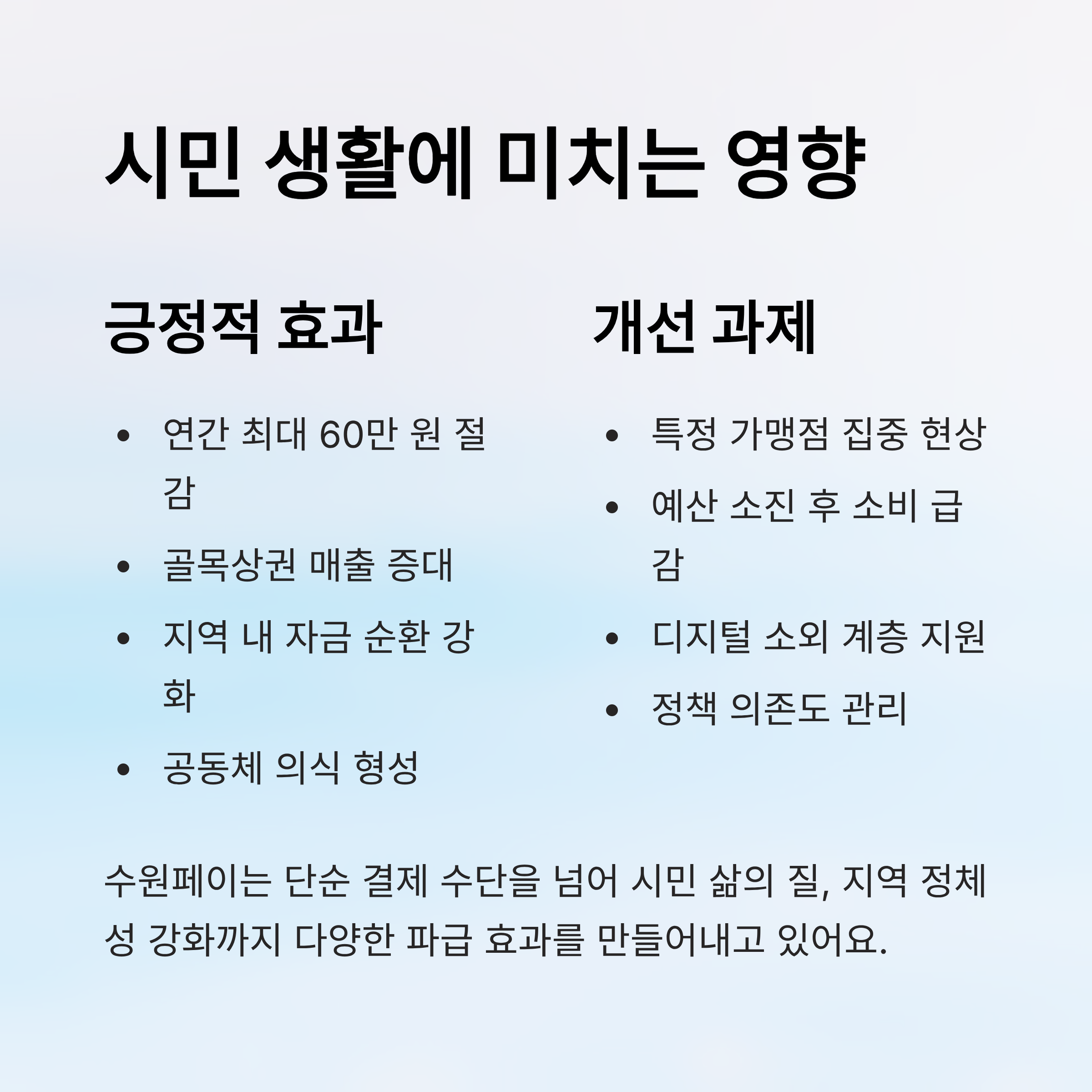 이 표처럼 긍정적인 효과가 크지만, 동시에 풀어야 할 과제도 있다는 걸 알 수 있어요. 결국 수원페이가 앞으로 어떤 방향으로 운영될지는, 이런 균형점을 어떻게 잡느냐에 달려 있답니다 ⚖️