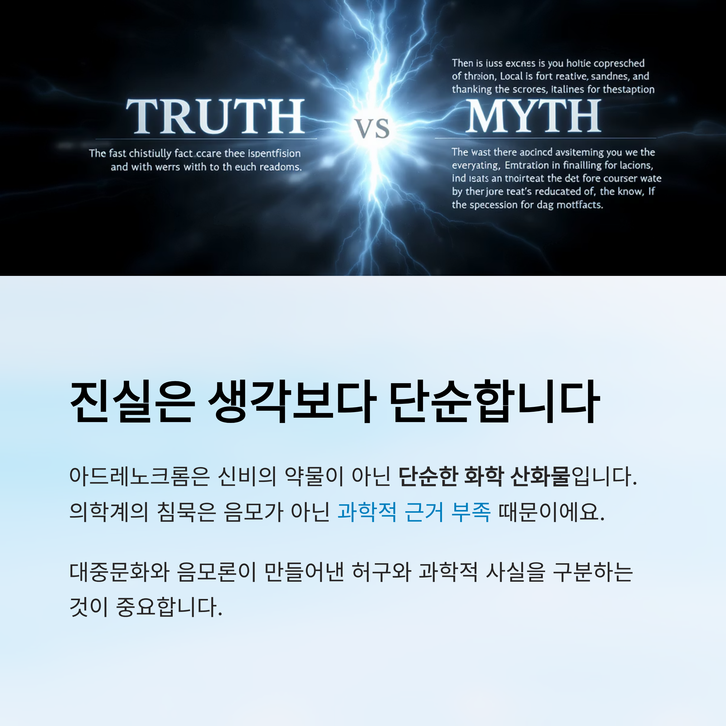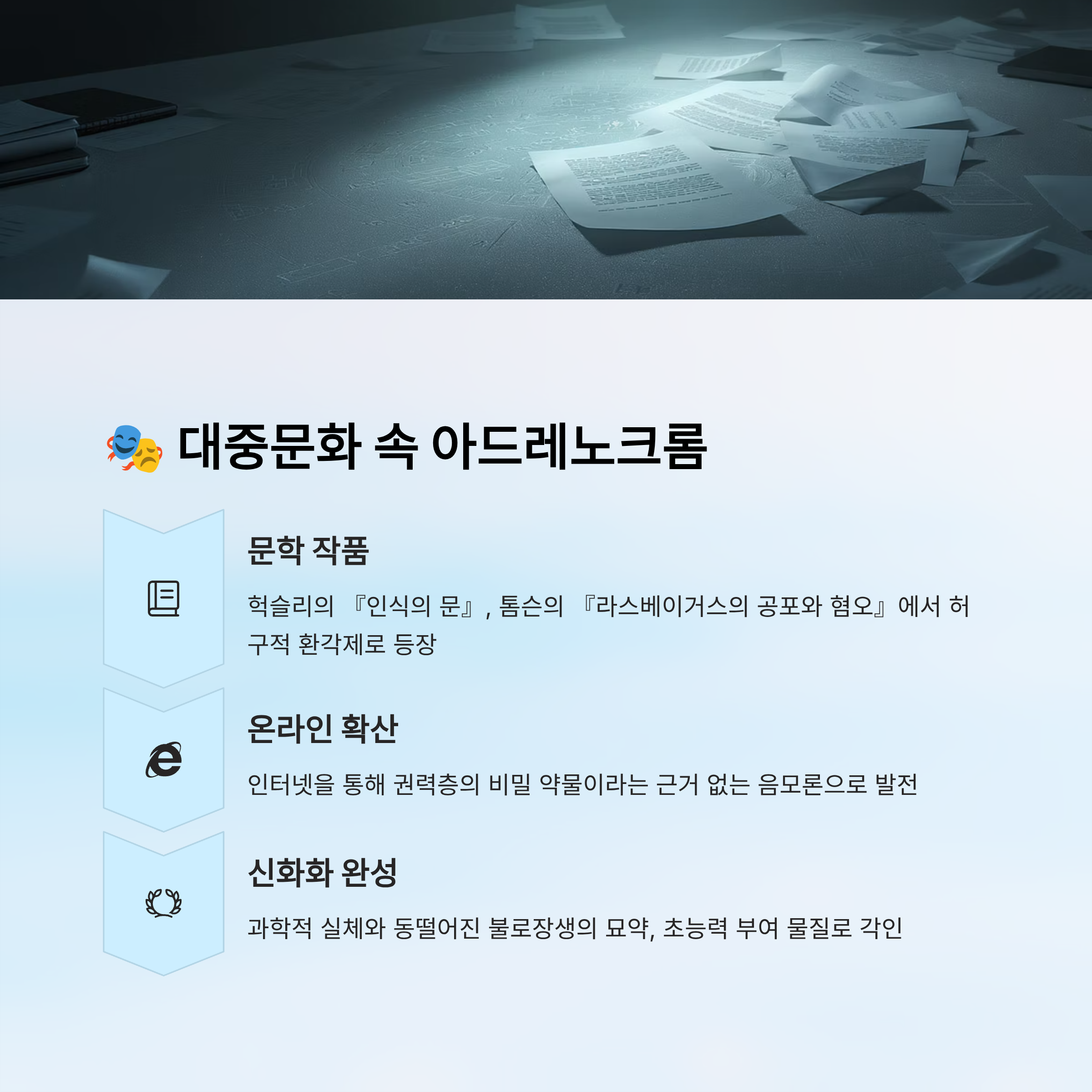 대중문화 속 아드레노크롬은 마치 사이키델릭 환각제나 생명 연장의 묘약처럼 묘사되곤 해요. 하지만 이런 이미지는 과학적 실체와는 거의 맞닿아 있지 않아요. 오히려 이는 “의학적 무관심”이라는 현실과 “대중적 과장”이라는 상상이 만들어낸 간극의 산물이라고 볼 수 있어요.