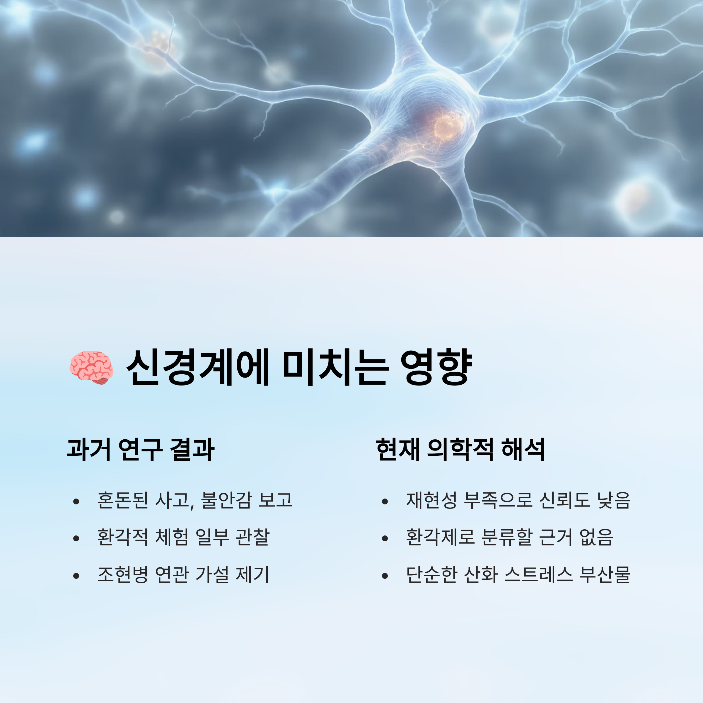 | 1960년대 | 소규모 연구팀 | 정신 증상 유발 가능성 조사 | 혼란, 기분 변화 보고 |