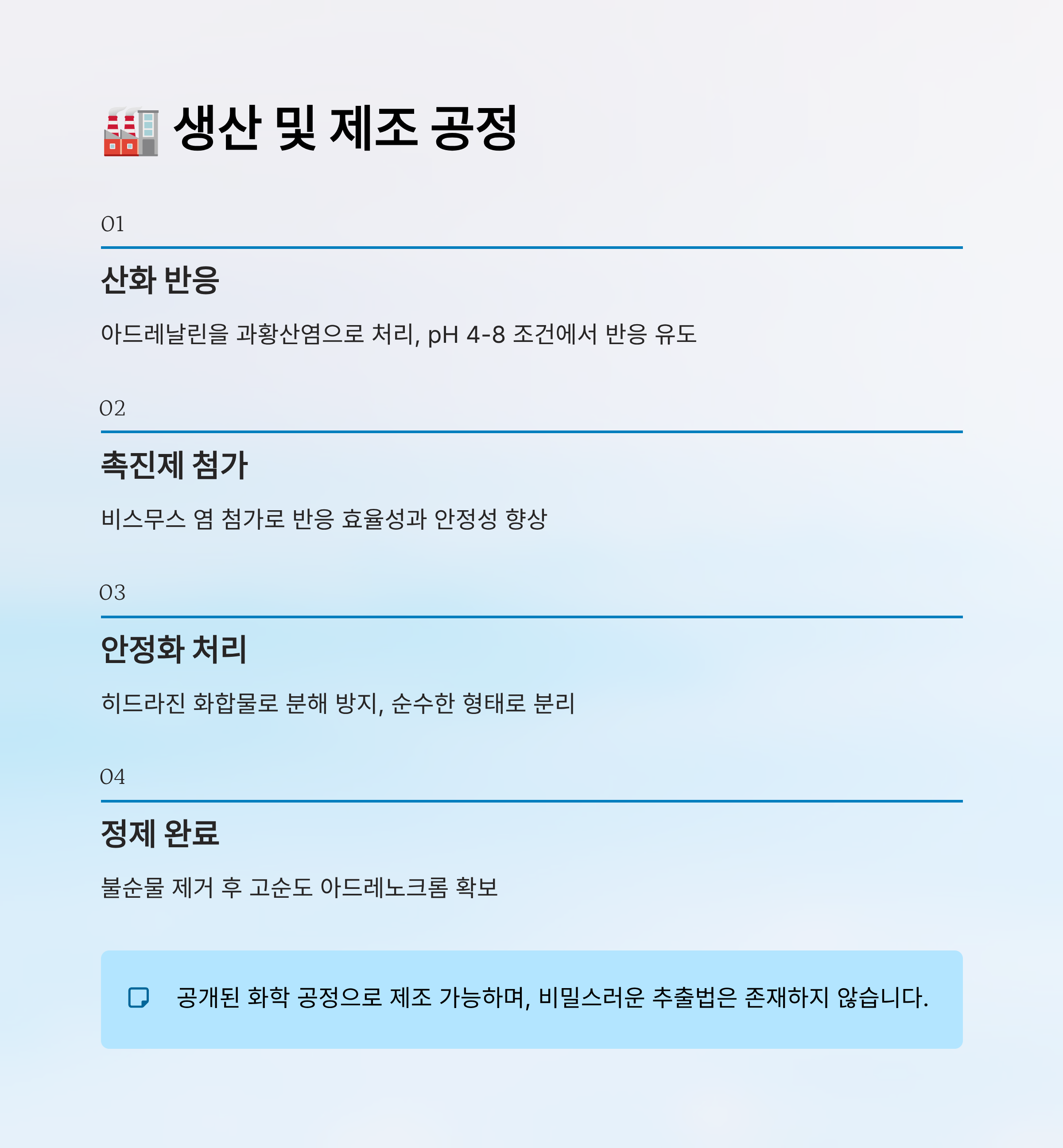 | 4. 정제 | 여과, 불순물 제거 | 순수 아드레노크롬 확보 |