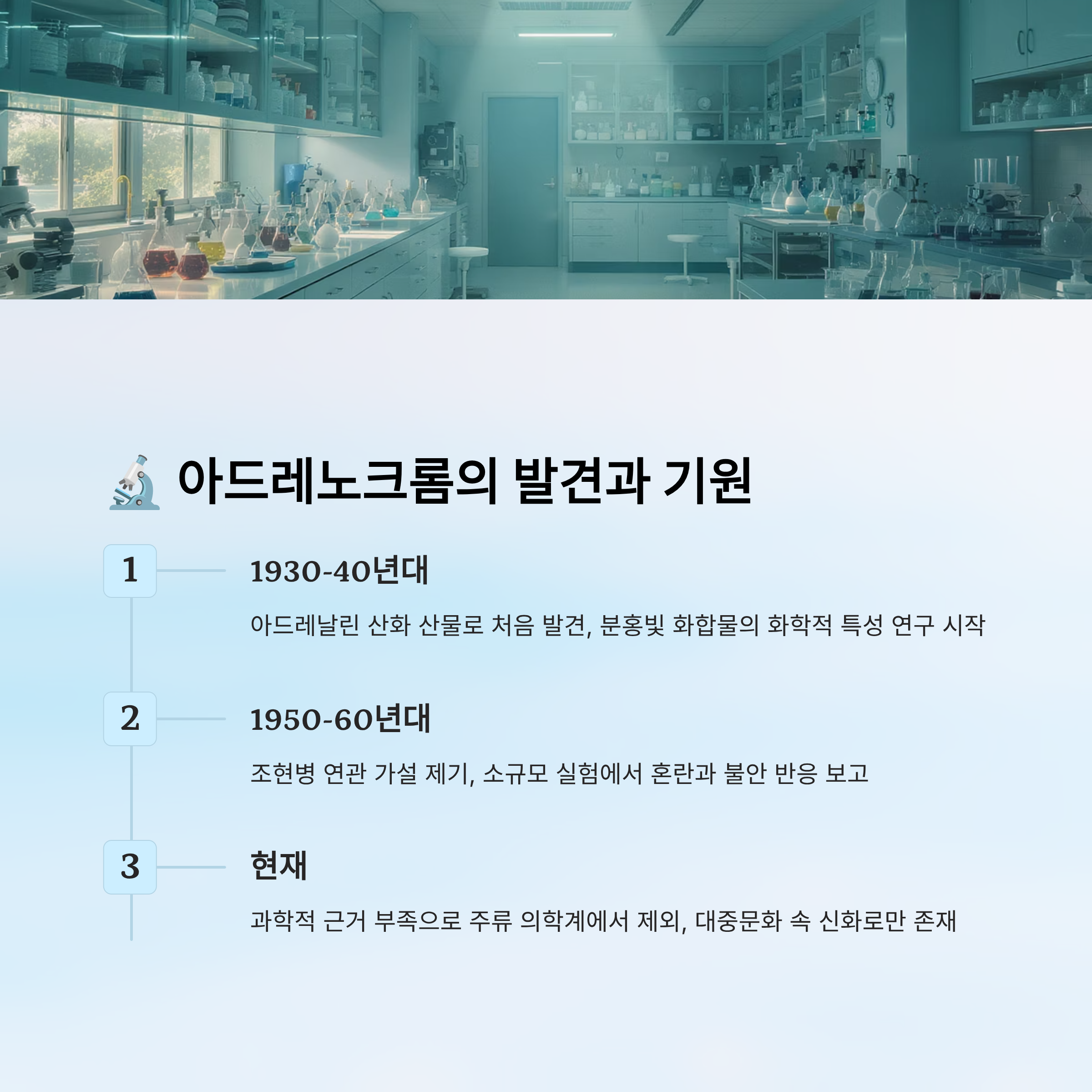 위 표에서 보듯 아드레노크롬은 ‘발견 → 가설 제기 → 관심 감소 → 대중적 신화화’라는 과정을 밟아왔어요. 학문적 궤적과 대중적 상상력이 극명하게 엇갈린 사례라고 할 수 있죠. 이 흐름이야말로 지금 우리가 아드레노크롬을 둘러싼 진실과 허구를 구분해야 하는 이유예요. 🔎