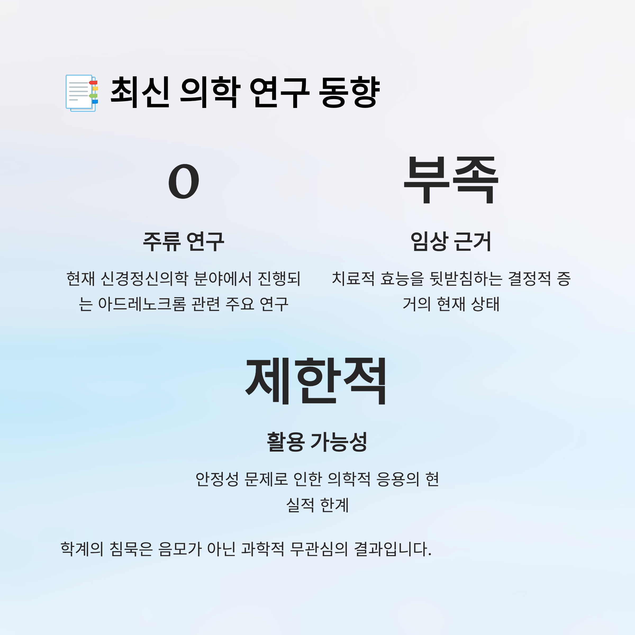 오늘날 아드레노크롬은 주류 의학 연구에서 거의 다뤄지지 않아요. 이유는 간단해요. 과거 연구들이 재현성이 부족했고, 신경정신학적 질환과 직접적인 인과관계를 입증하지 못했기 때문이에요. 대신 현대 의학계는 아드레노크롬을 뇌질환의 ‘원인’이라기보다는 산화 스트레스와 관련된 부산물로 바라보고 있어요.