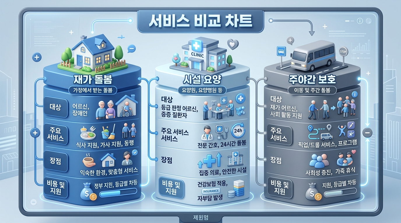| 방문요양 | 요양보호사가 가정 방문 (가사, 정서 지원) | 거동은 가능하나 가사 보조가 필요한 분 |