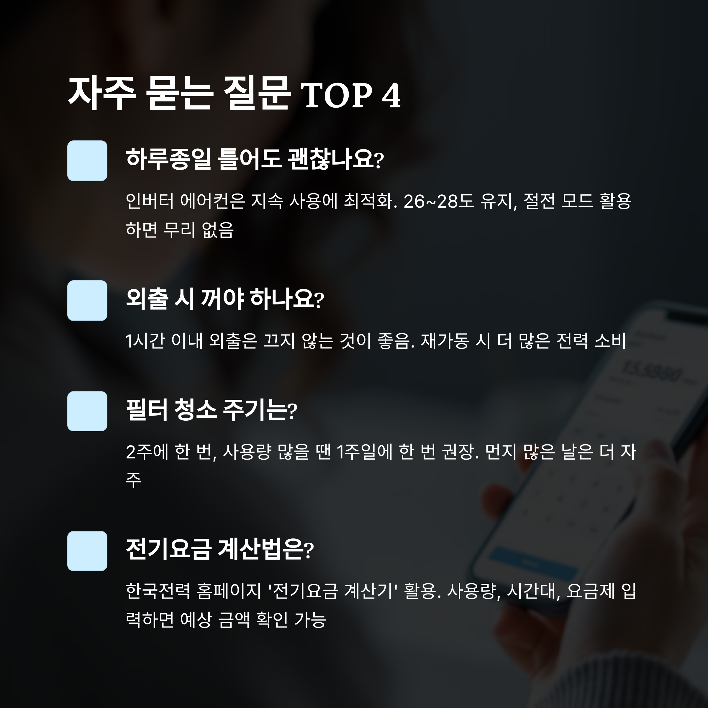 A1. 인버터 에어컨은 지속 사용에 최적화되어 있어요. 단, 문을 닫고 설정 온도를 26~28도로 유지하며 절전 모드를 활용하면 하루 종일 틀어도 큰 무리가 없어요.