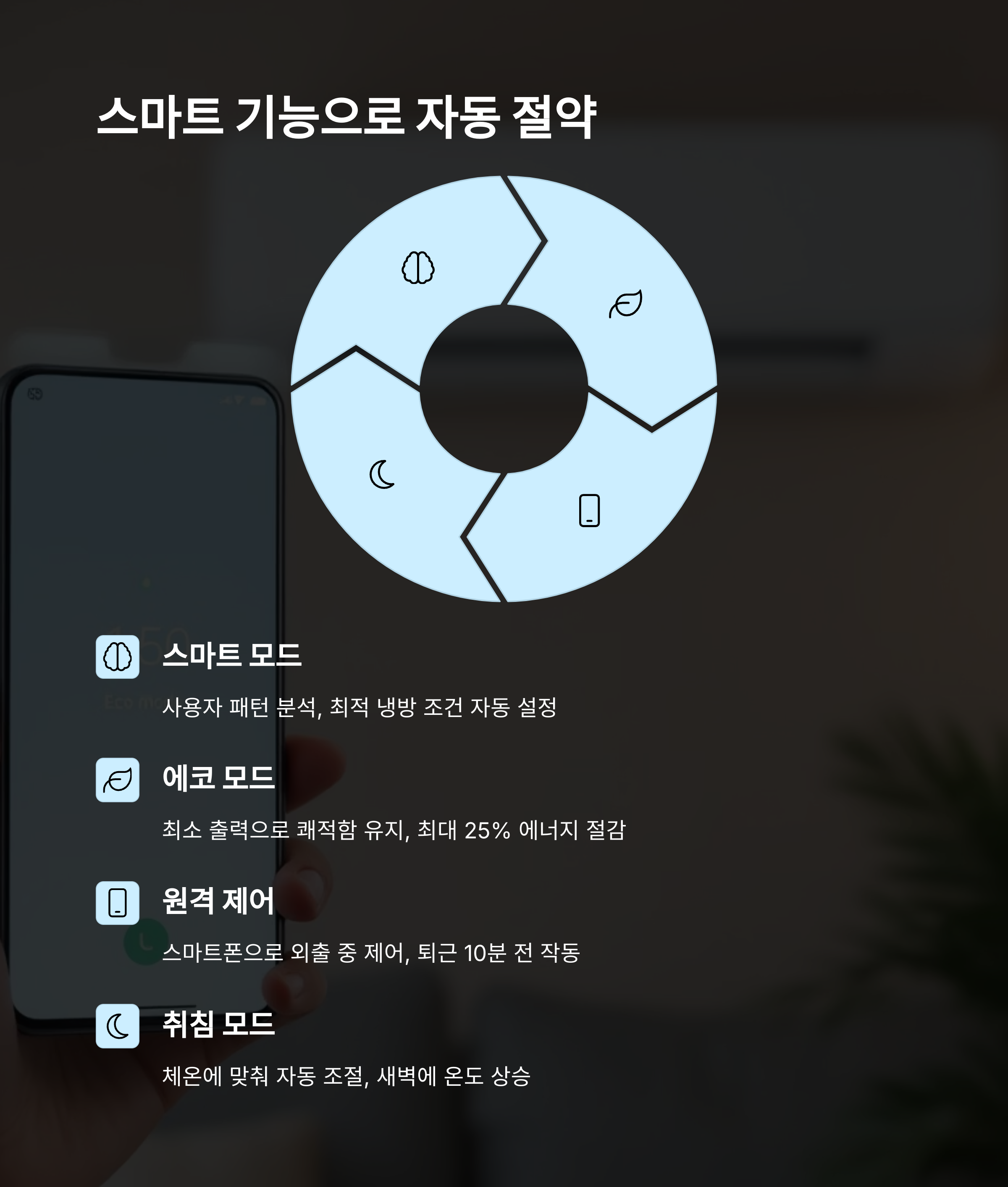 | 스마트폰 제어 | 원격 제어 | 최대 20% | 퇴근 10분 전 미리 작동 |