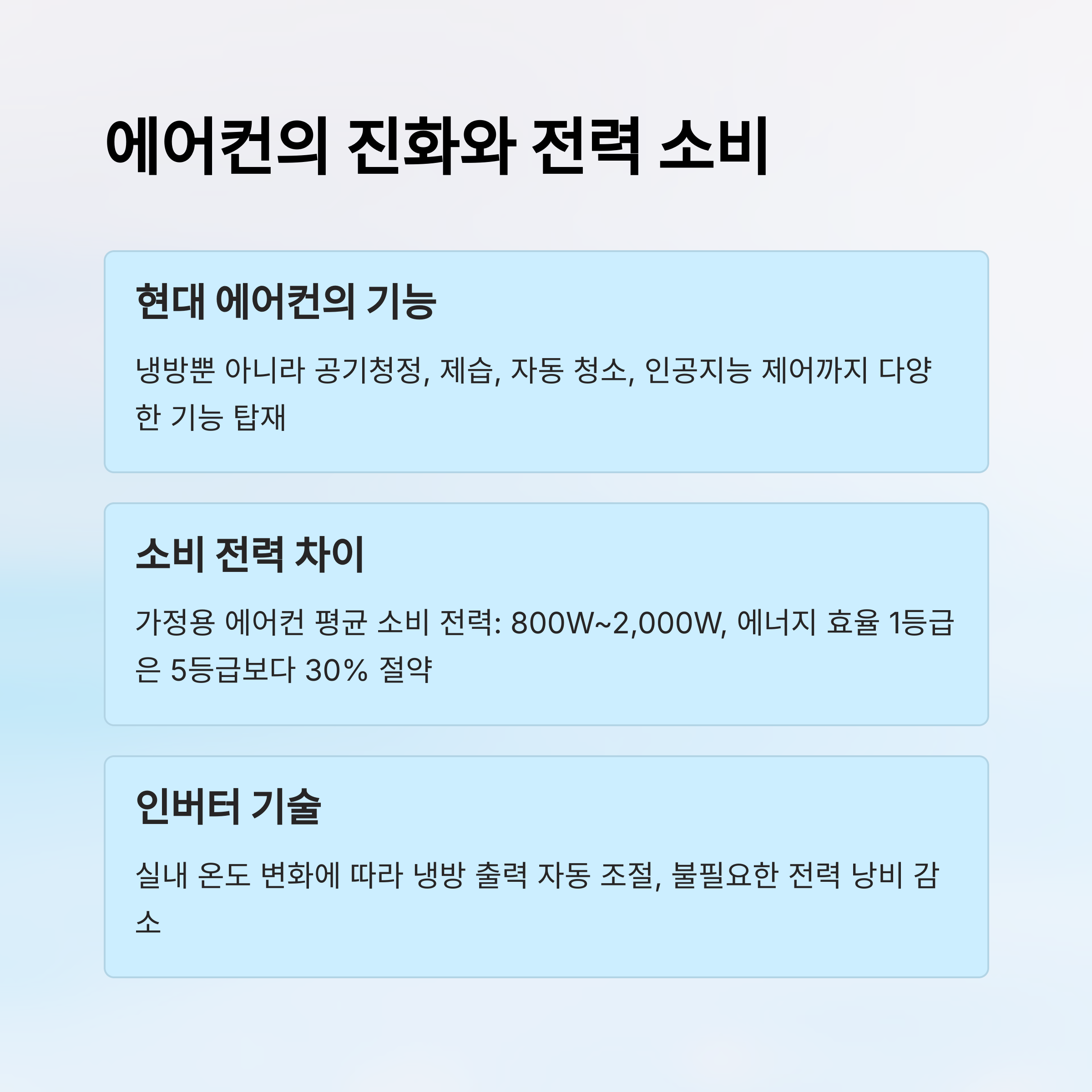 가정용 에어컨의 평균 소비 전력은 800W에서 2,000W까지 다양해요. 특히 냉방을 시작할 때 압축기와 팬 모터가 동시에 작동하면서 순간적으로 전력이 많이 소모돼요. 이 때문에 켰다 껐다를 반복하면 오히려 전기요금이 더 증가하는 원인이 되죠.