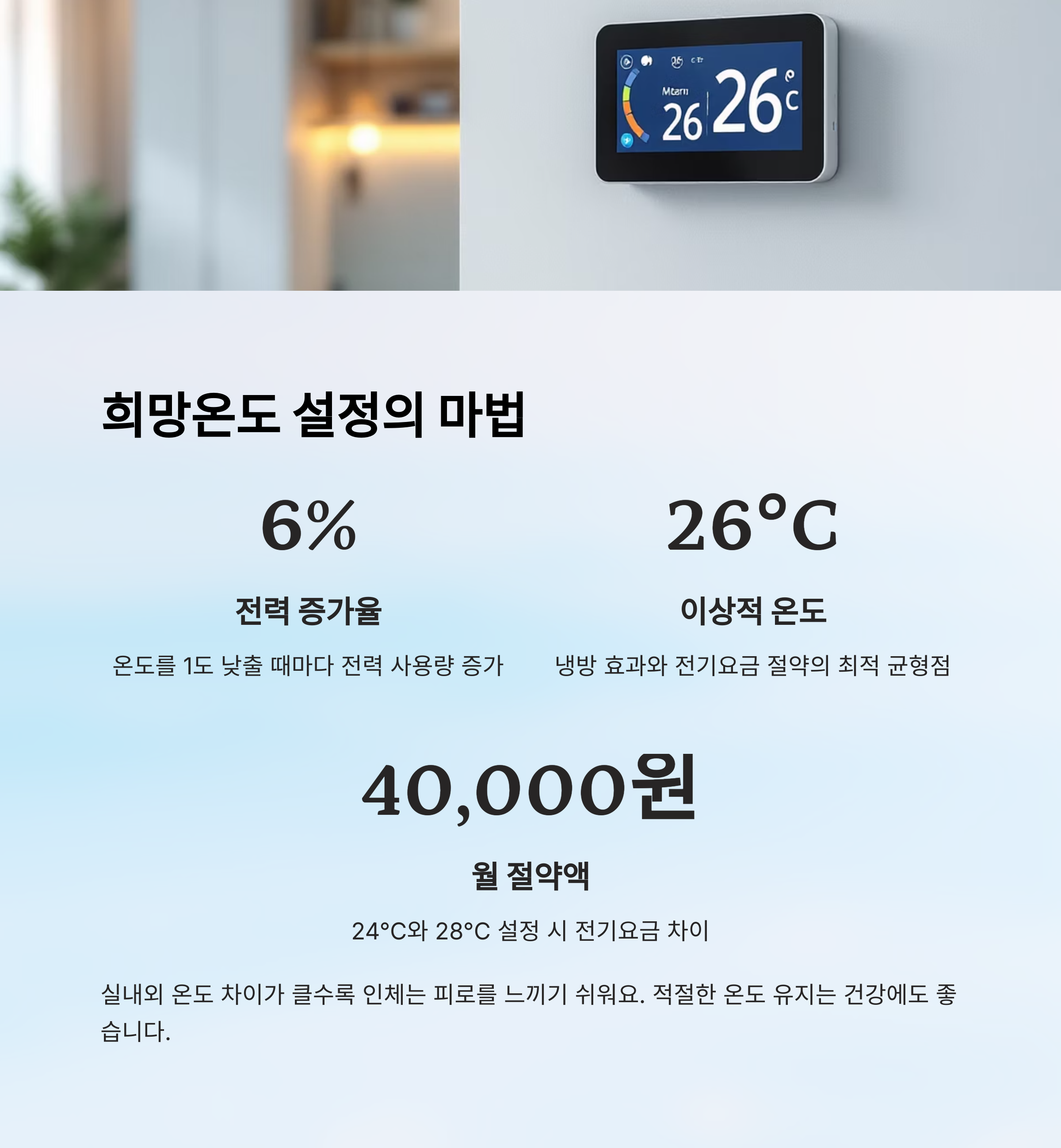 에어컨을 사용할 때 가장 많이 듣는 팁 중 하나가 바로 희망온도 설정이에요. 일반적으로 권장되는 에어컨 온도는 26도에서 28도 사이인데요, 이 범위를 벗어나서 너무 낮게 설정하면 에너지 소모가 급증해요. 1도 낮출 때마다 전력 사용량이 약 6%씩 증가한다는 사실, 알고 있었나요?