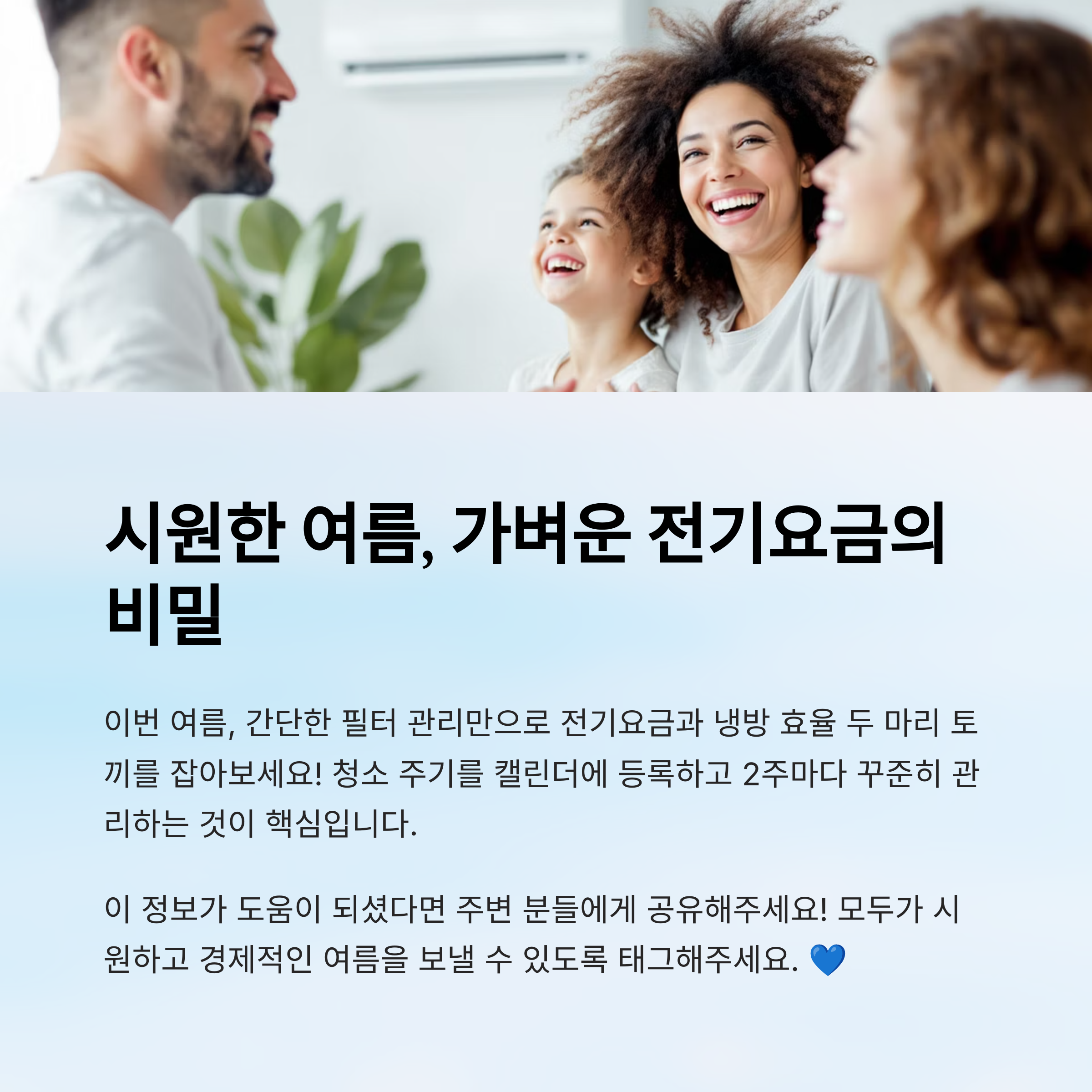 간단한 필터 관리만으로도 전기요금과 냉방 성능 두 마리 토끼를 잡을 수 있으니, 이 여름에는 꼭 필터 상태부터 점검해보세요! 냉방 효율의 출발은 ‘청소’에서 시작되거든요. 😎