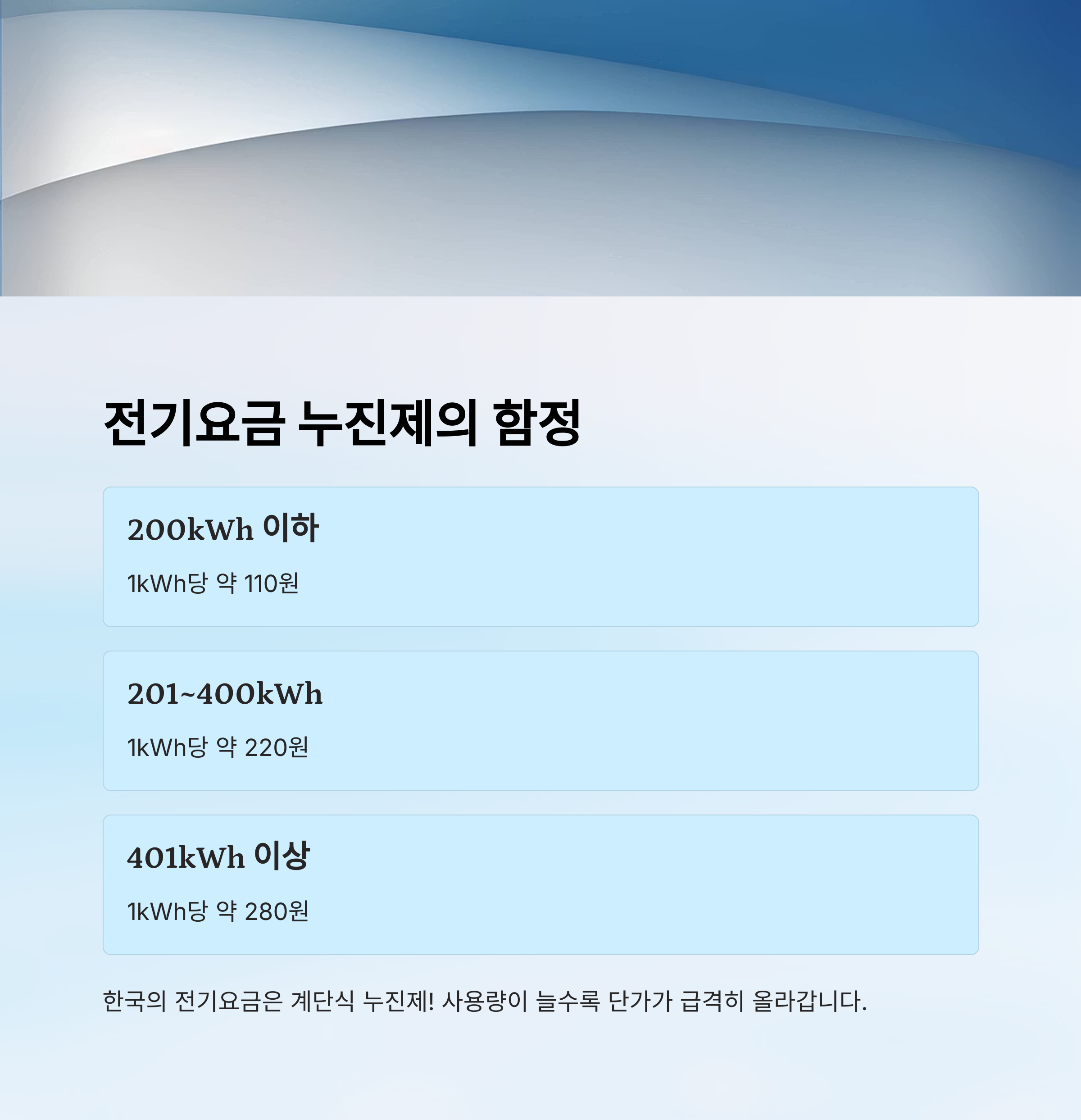 예를 들어 월 200kWh 이하 사용 시에는 1kWh당 약 110원이지만, 사용량이 400kWh를 넘으면 280원 이상으로 올라갈 수 있어요. 그래서 여름철 에어컨을 하루 몇 시간만 틀어도 누진 구간에 도달하면 전기요금이 눈덩이처럼 커질 수 있는 거죠.