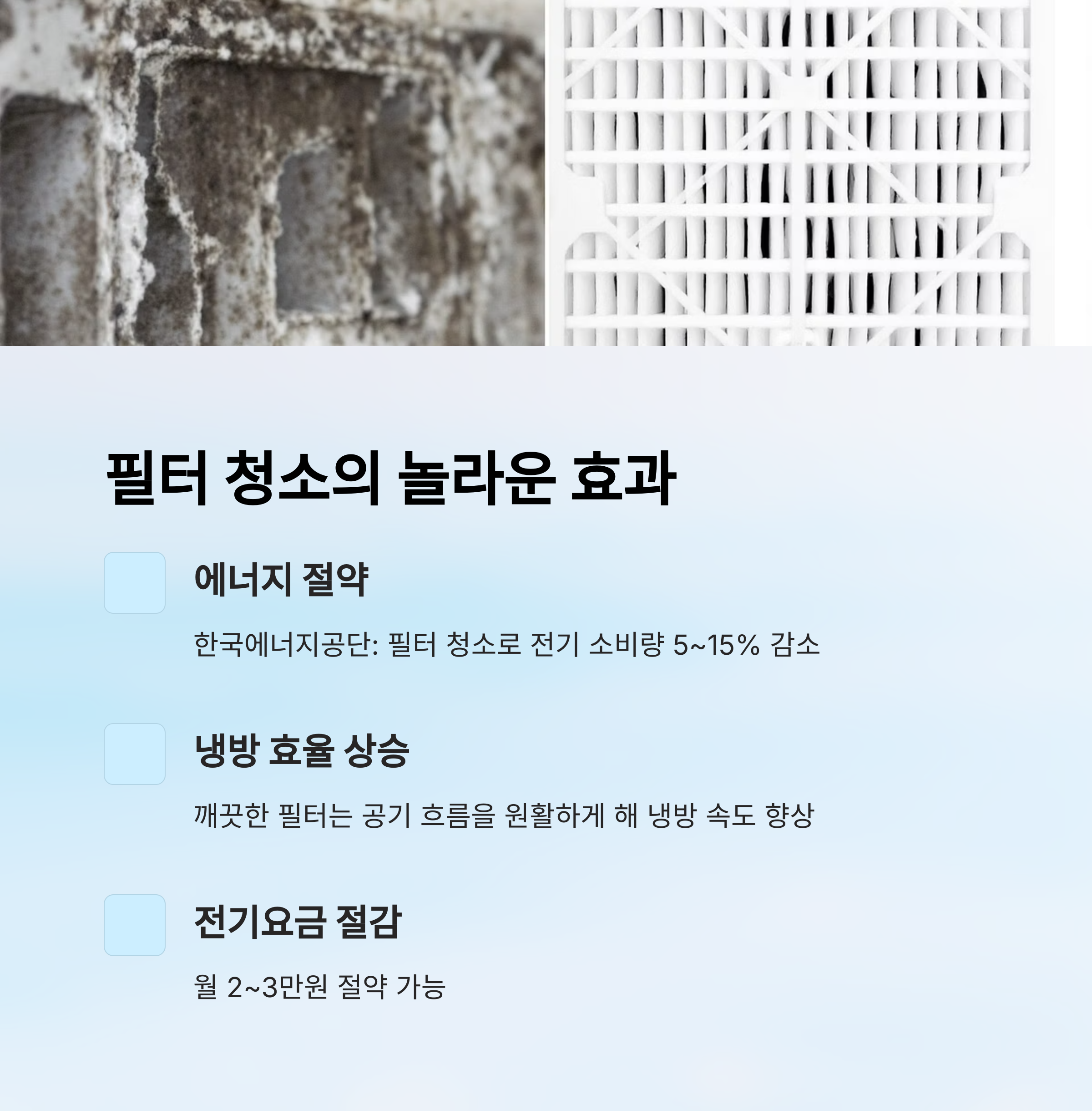 한눈에 봐도 필터 청소만으로도 냉방 효율이 확연히 달라진다는 걸 알 수 있어요. 지금 바로 필터를 점검해보고, 에어컨과 전기요금 모두 잡아보세요!