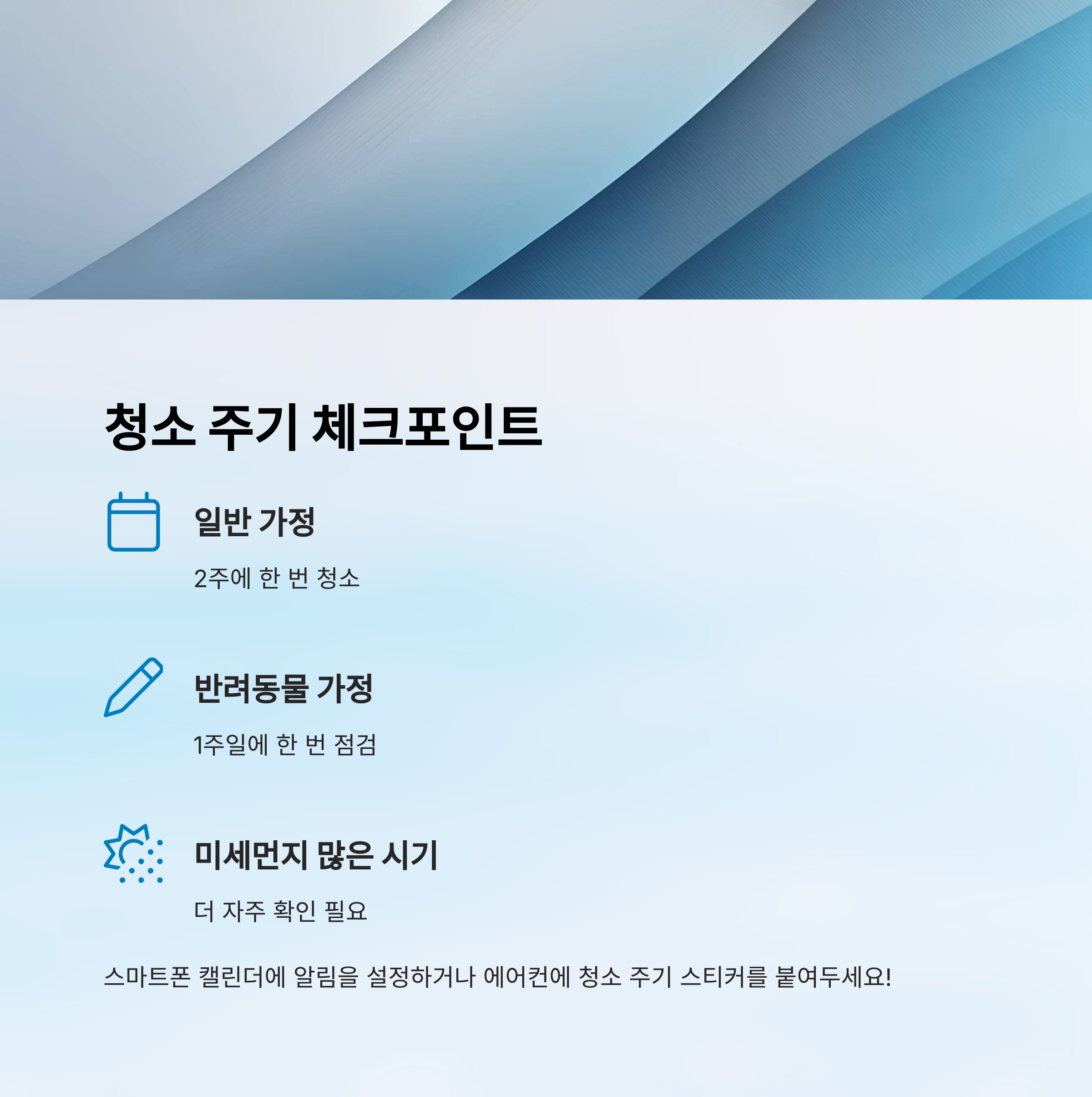 청소 주기를 놓치지 않기 위해 스마트폰 캘린더에 알림을 설정해 두거나, 에어컨에 청소 주기 스티커를 붙여두는 것도 좋은 방법이에요. 이렇게 하면 깜빡하지 않고 꾸준히 관리할 수 있어요.