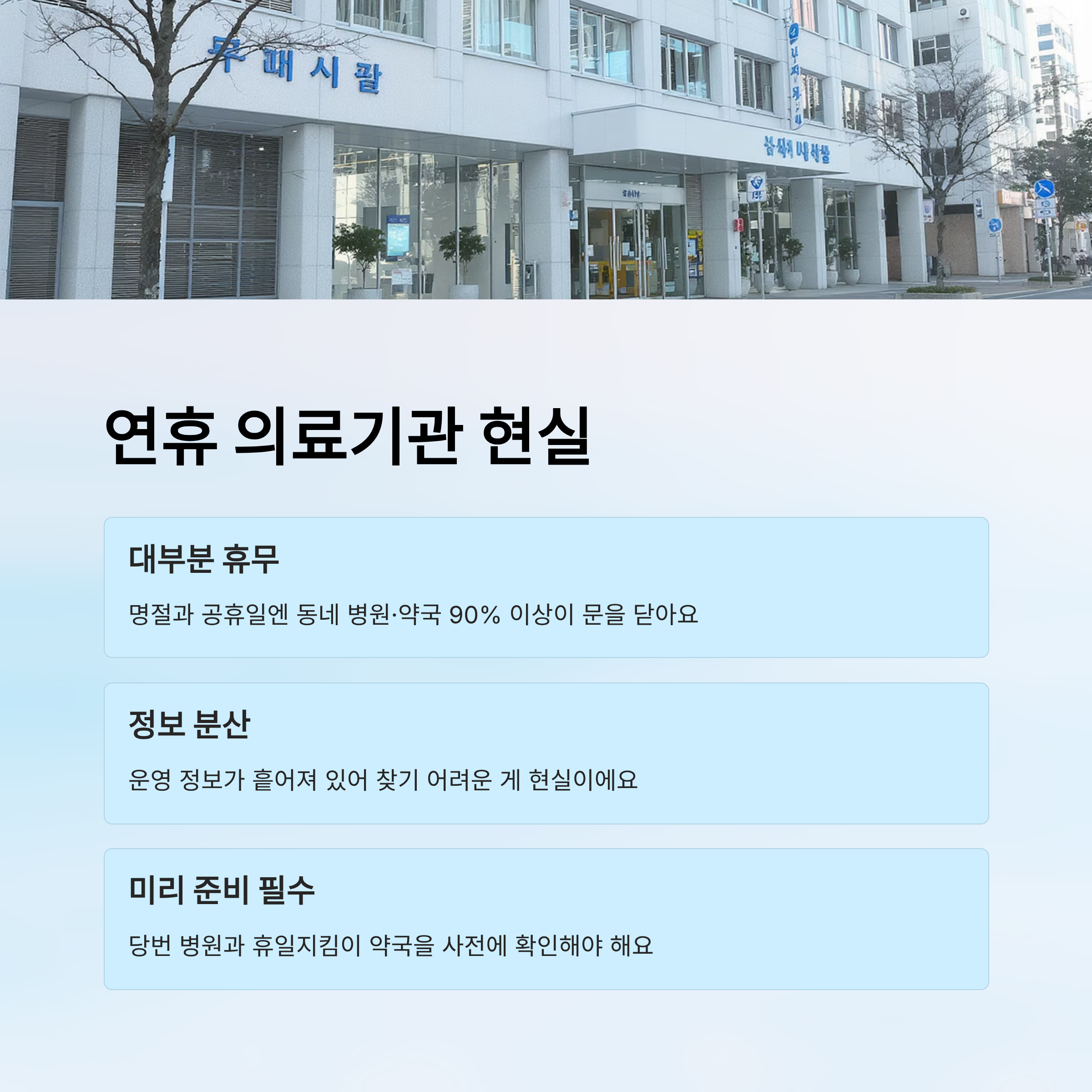 명절이나 공휴일이 이어지는 연휴 기간에는 대부분의 병원과 의원, 약국들이 휴무에 들어가요. 특히 설날, 추석, 어린이날 같은 전국적인 공휴일에는 동네의원과 개인 약국 대부분이 문을 닫는 경우가 많답니다. 그렇기 때문에 갑자기 아프거나 약이 필요해도 가까운 곳에서는 이용이 어려운 상황이 종종 생겨요.