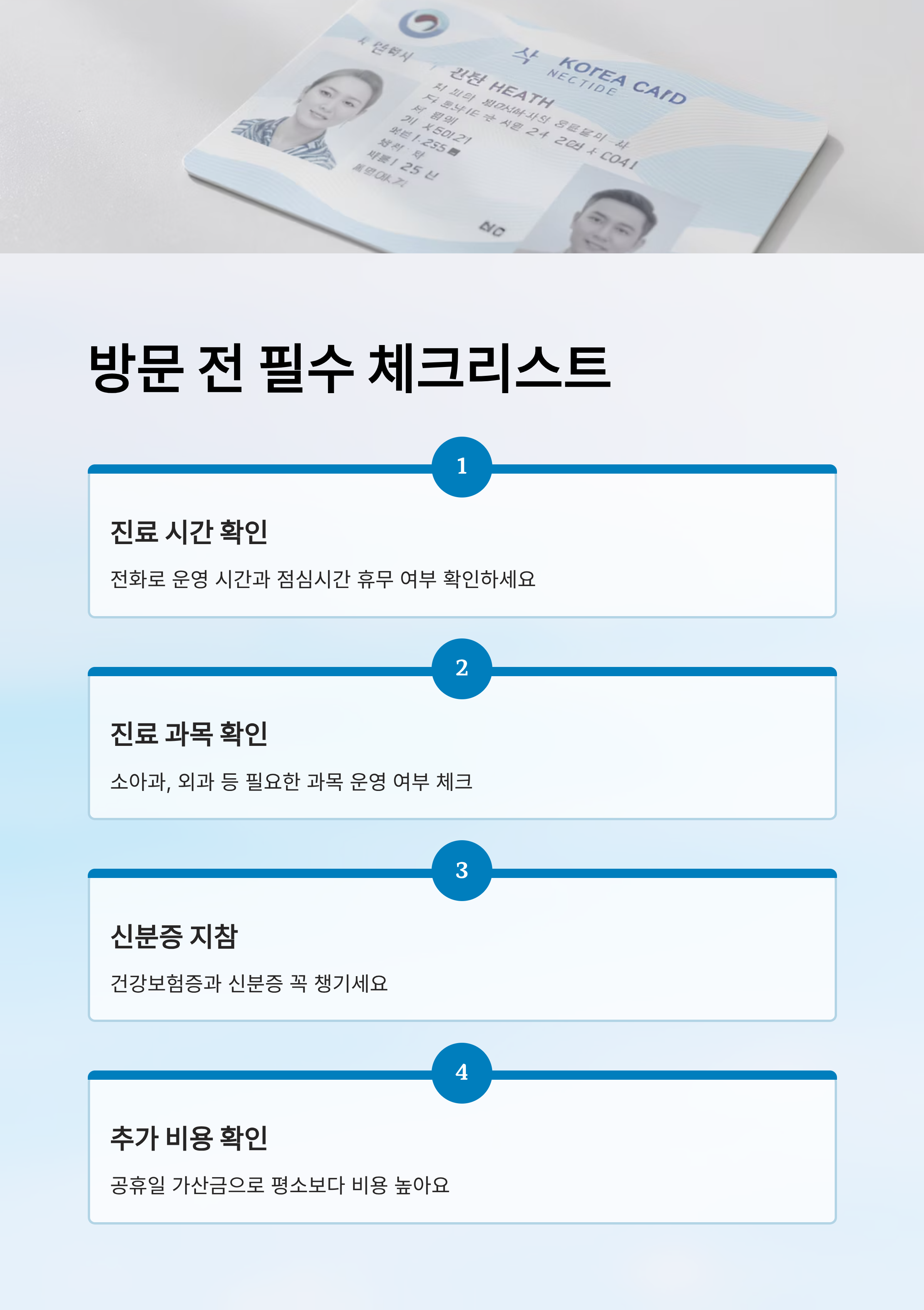 이렇게 체크리스트를 한 번 쭉 훑어보고 준비하면 병원 방문 시 실수가 줄어들어요. 특히 가족 단위 이동이 많은 연휴에는 이런 정보가 더 소중하답니다!