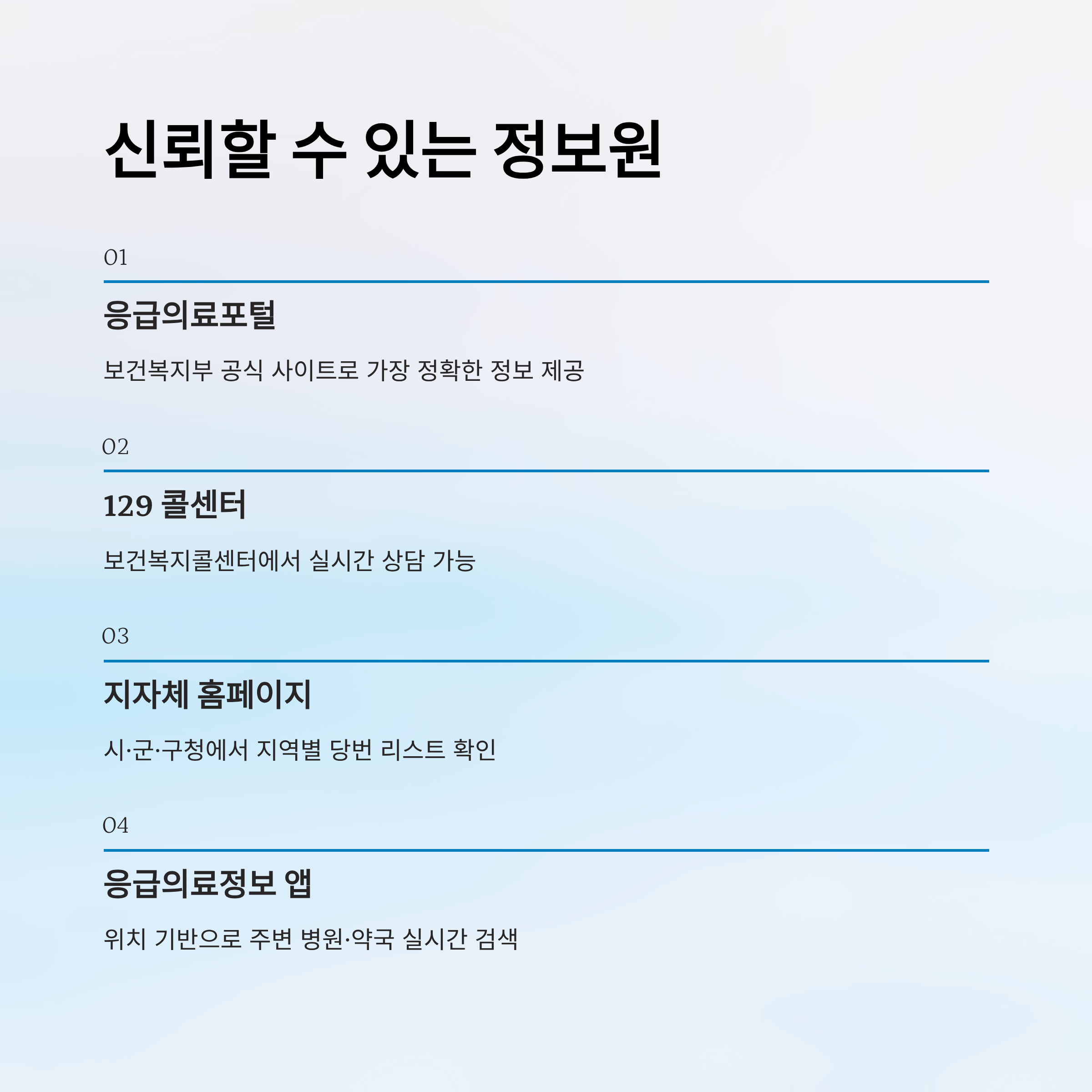 그래서 미리미리 지역 응급의료정보센터나 보건소 홈페이지, 129 보건복지콜센터를 통해 확인해 두는 것이 가장 확실해요. 휴무 전, 또는 연휴 첫날에 미리 체크해 두면 예상치 못한 상황에서도 당황하지 않을 수 있어요.