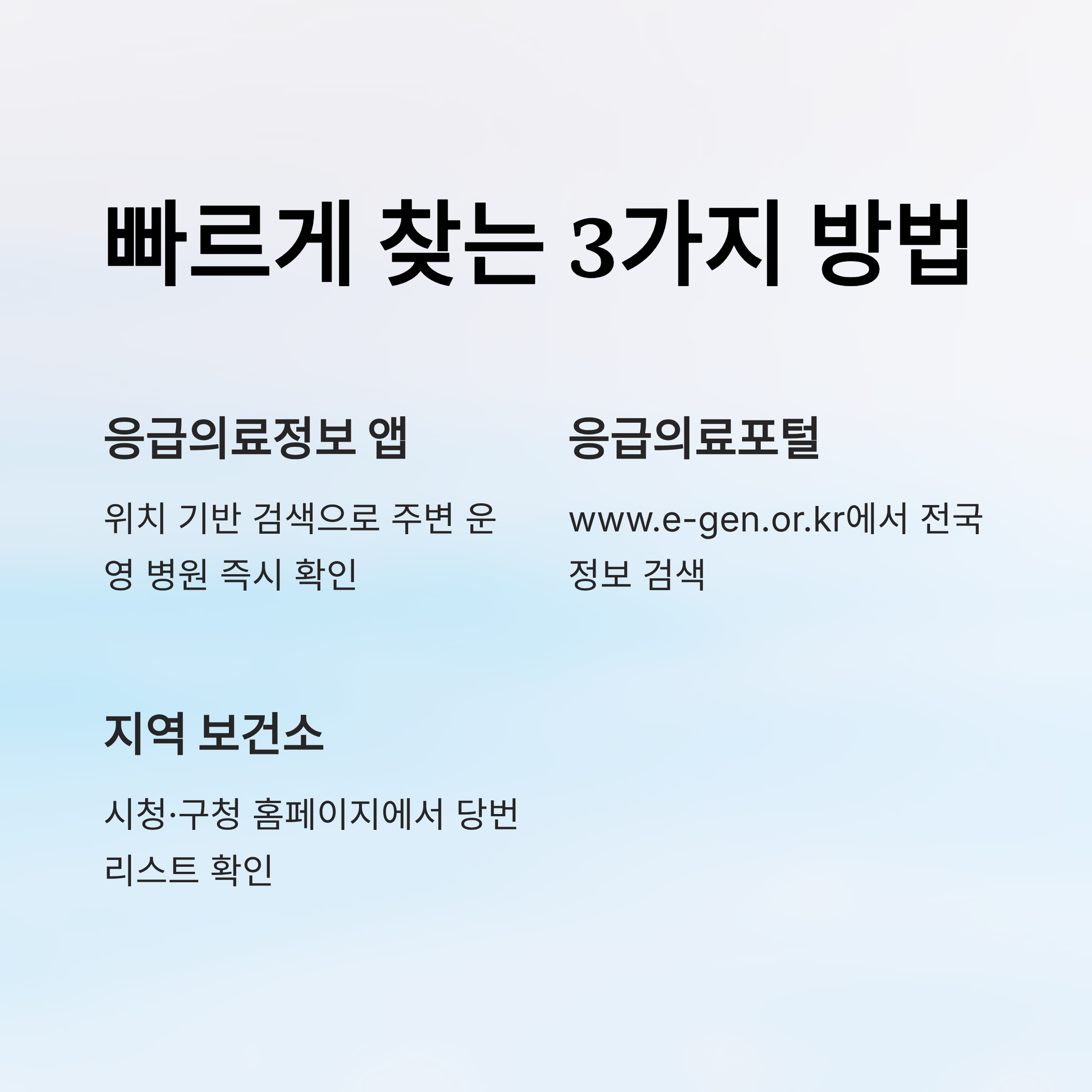 A1. ‘응급의료포털’ 웹사이트나 ‘응급의료정보제공’ 앱에서 위치 기반으로 확인할 수 있어요. 시청·보건소 홈페이지에도 리스트가 올라와요.
