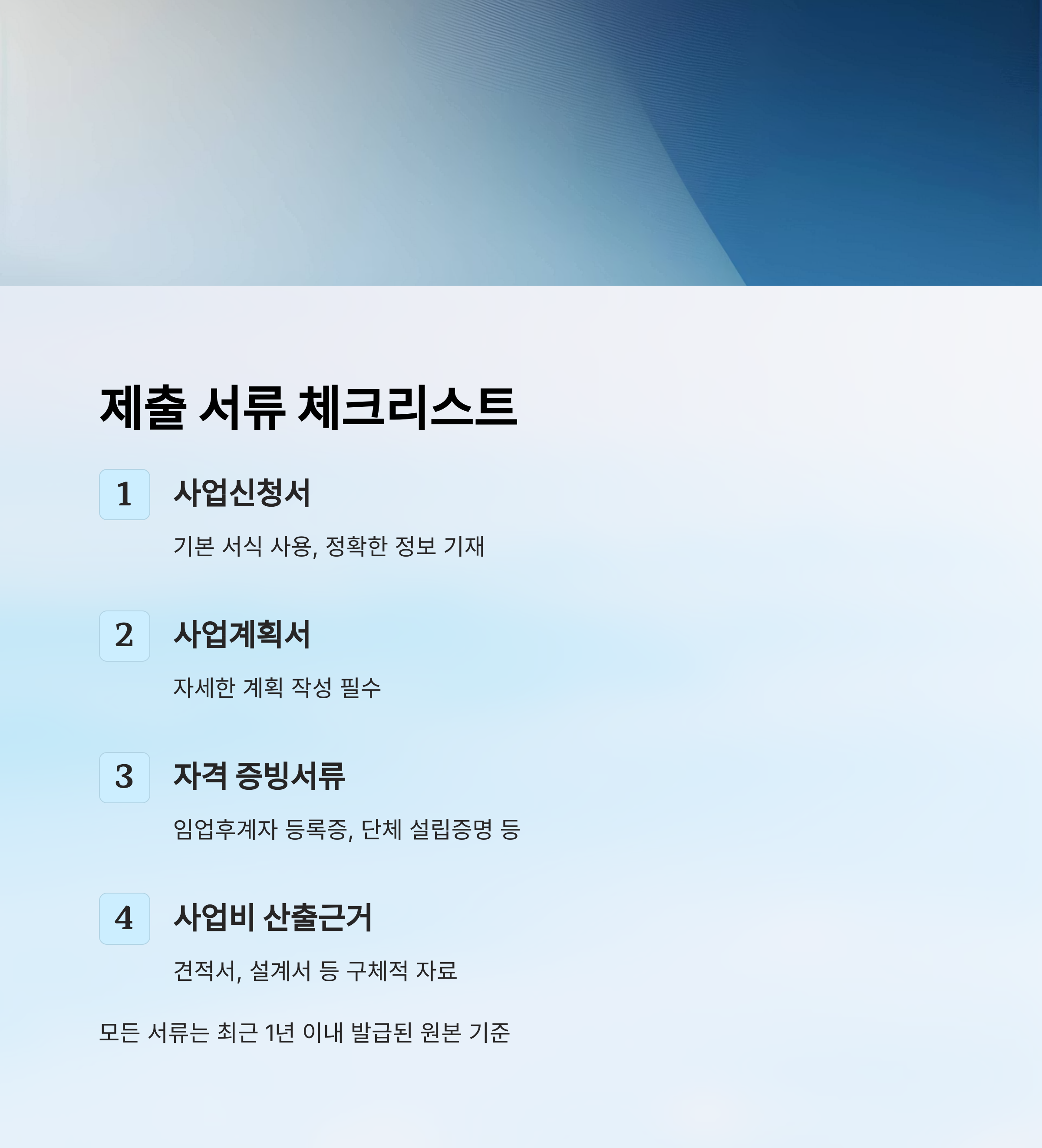 서류는 최근 1년 이내 발급된 원본을 기준으로 하고, 복사본 제출 시에는 원본대조필이 필요할 수 있어요. 잘못된 서류는 보완 요청이 오기도 하니까 꼼꼼히 확인해주세요!