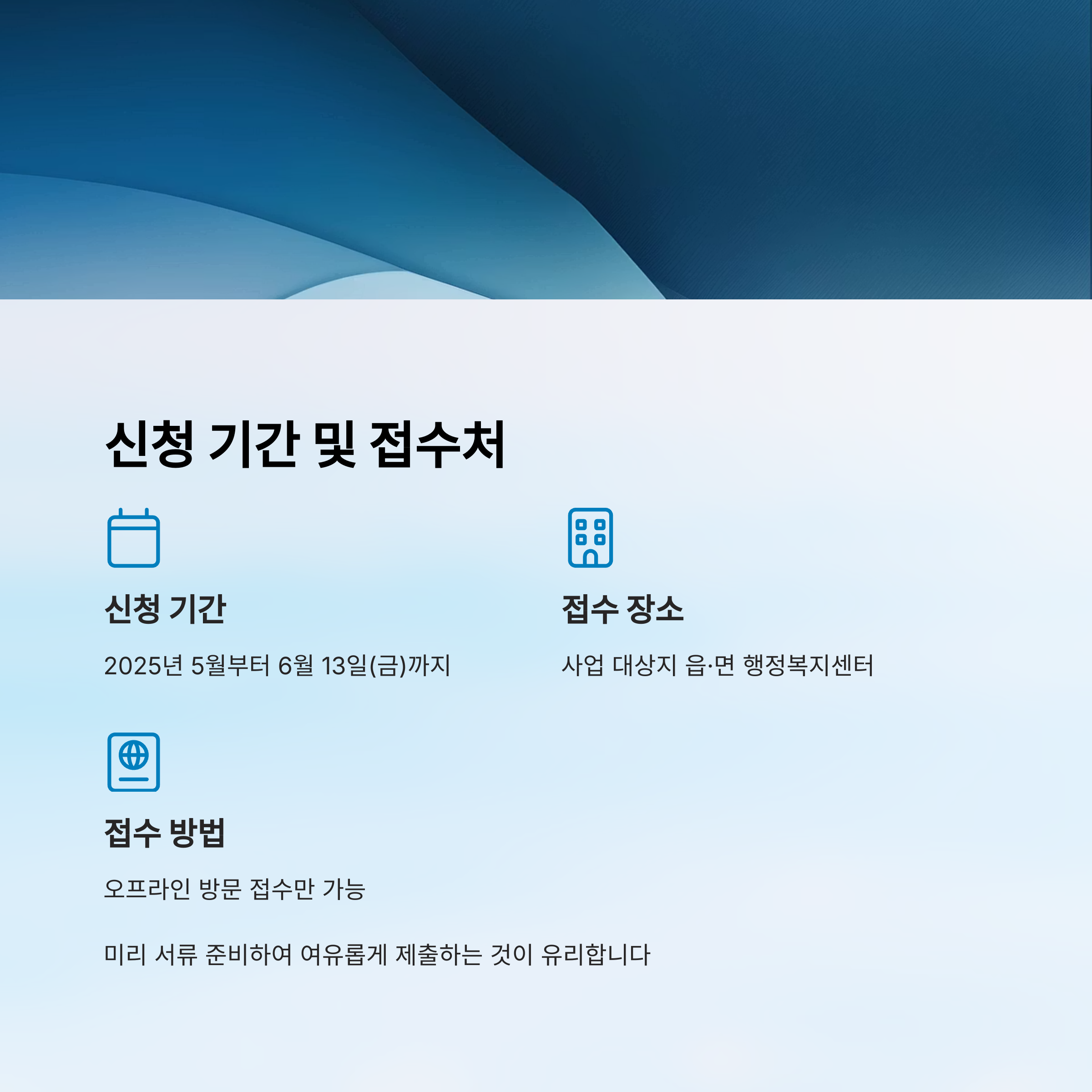 신청은 온라인이 아니라 오프라인 접수만 가능해요. 반드시 사업 대상지에 해당하는 읍·면 행정복지센터에 직접 방문해서 접수해야 하죠. 주민등록지 기준이 아니라 사업 대상지 기준이라는 점도 유의해야 해요.
