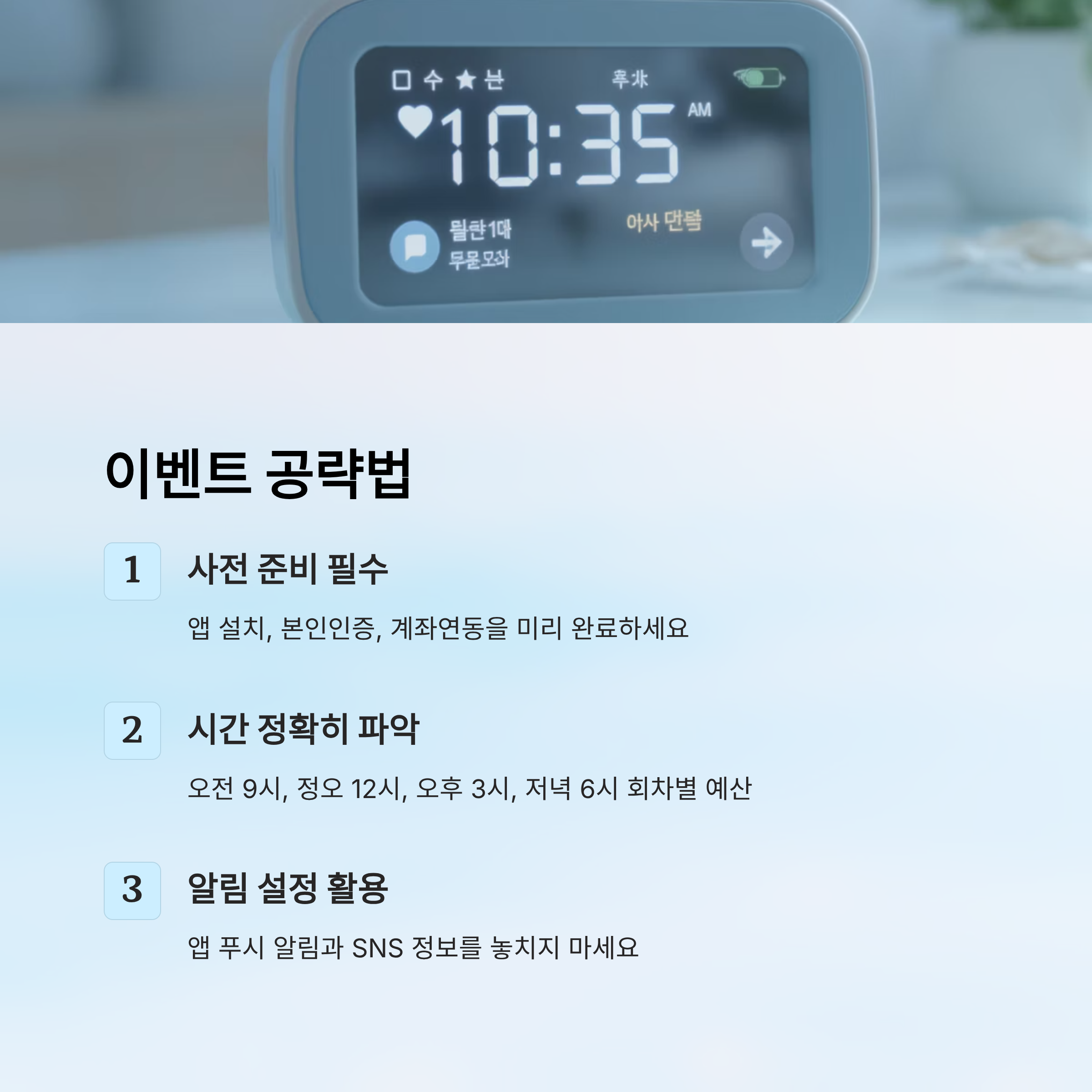 먼저, 사전 준비는 필수예요. 앱 설치, 본인 인증, 계좌 연동 등을 미리 해놓으면 이벤트 시작과 동시에 바로 결제할 수 있어요. 앱 인증이 느리면 순식간에 마감돼 버리니, 타이밍 놓치지 않도록 전날부터 준비하는 게 핵심이에요!