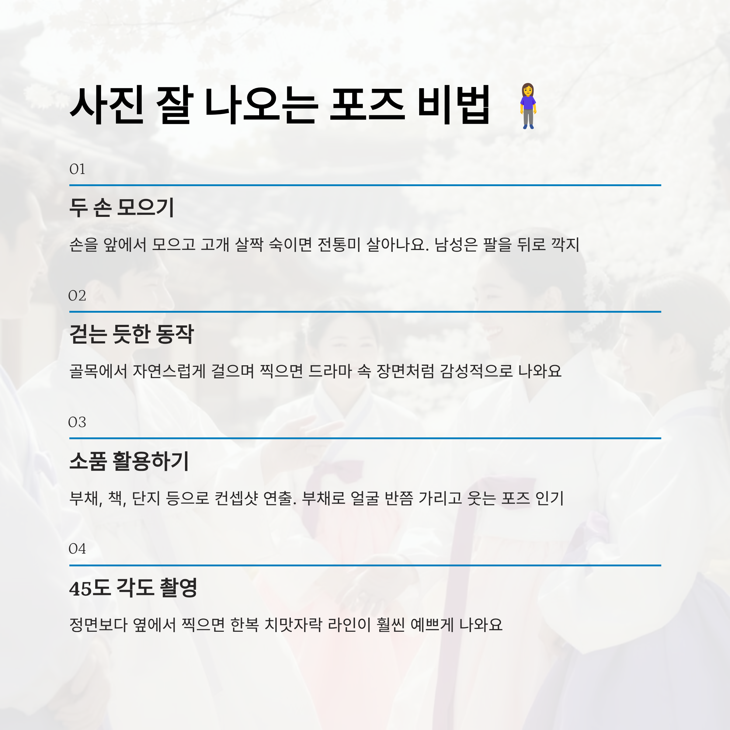 한복을 입고 멋지게 사진을 찍기 위해선 의상만큼이나 중요한 게 바로 ‘포즈’예요. 아무리 배경이 좋아도 어색한 자세는 멋진 인생샷을 망쳐버릴 수 있거든요. 그래서 오늘은 한복 입은 날 찰떡같이 어울리는 포즈 몇 가지를 알려드릴게요.