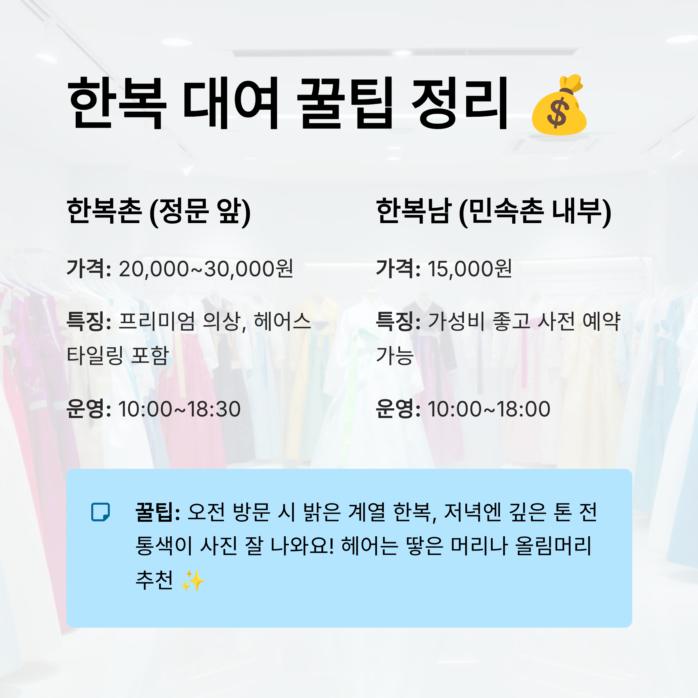 | 한복촌 | 정문 앞 100m | 10:00~18:30 | 20,000~30,000원 | 프리미엄, 스타일링 포함 |