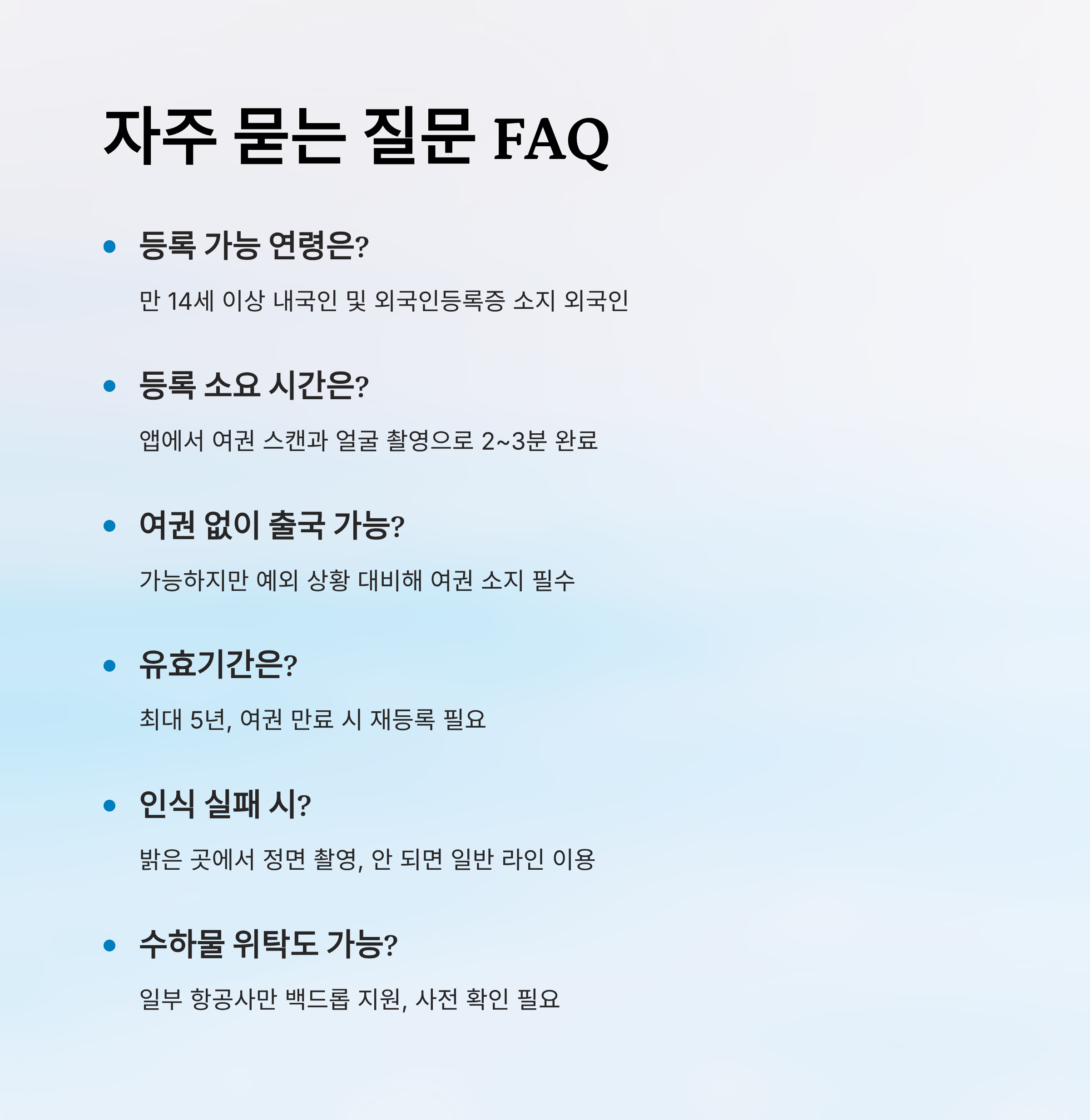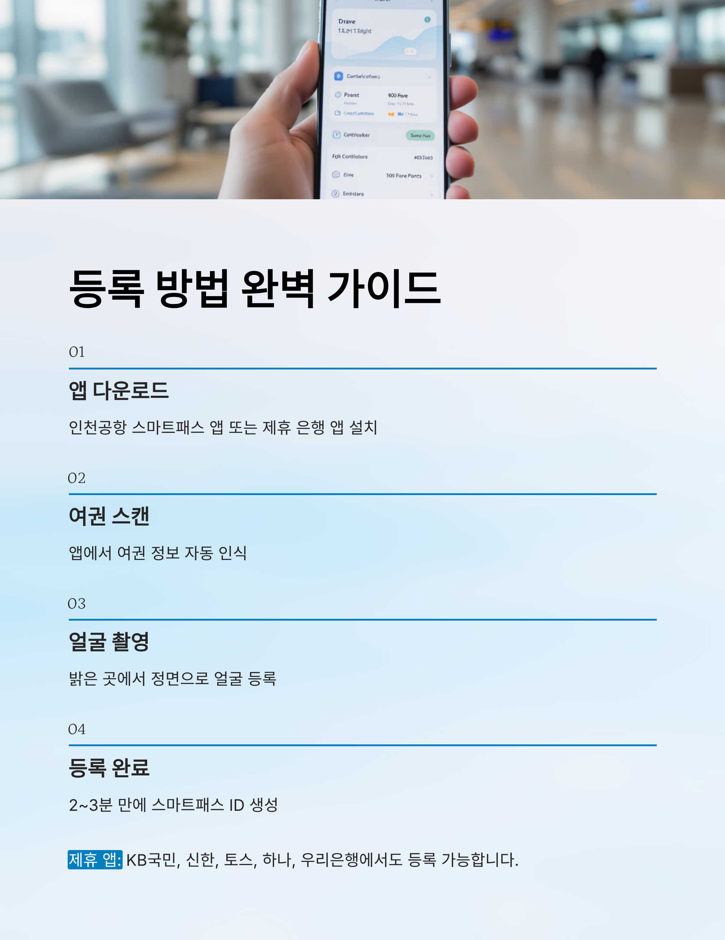 앱에 접속하면 '스마트패스 등록' 메뉴를 선택하고, 본인의 여권을 스캔한 뒤, 얼굴을 촬영해서 등록하면 돼요. 전체 과정은 2~3분이면 완료되고, 얼굴 인식은 밝은 곳에서 정면으로 찍는 게 인식률을 높이는 팁이에요.