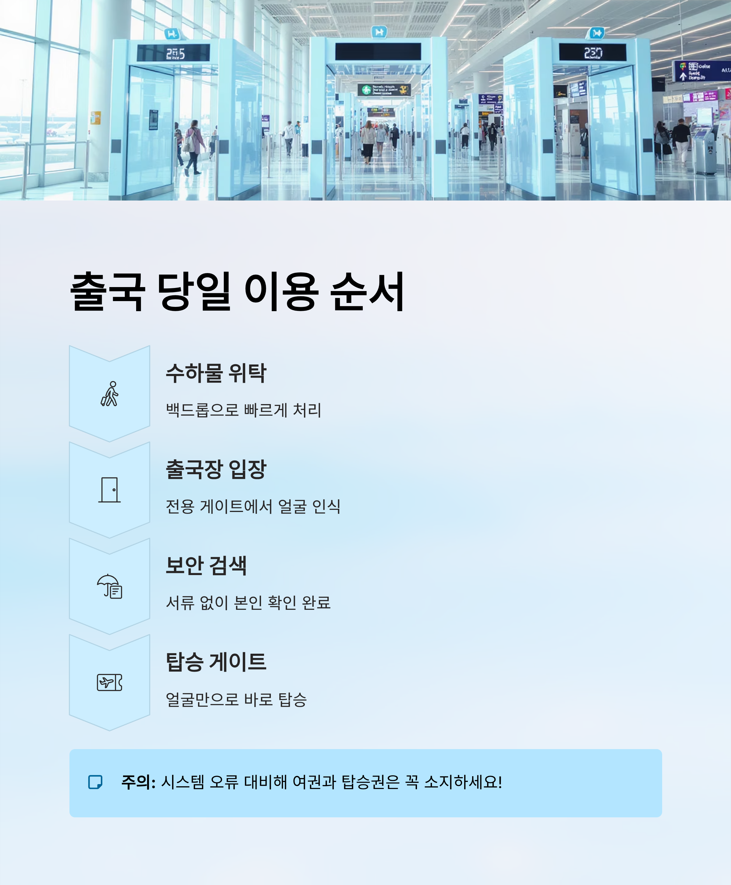 만약 얼굴 인식이 잘 안 되거나 시스템 오류가 발생할 경우를 대비해 여권과 탑승권은 꼭 챙기세요. 드물게 장비 인식 오류가 발생할 수 있거든요. 이런 상황에서는 일반 출국 라인으로 우회할 수 있어요.