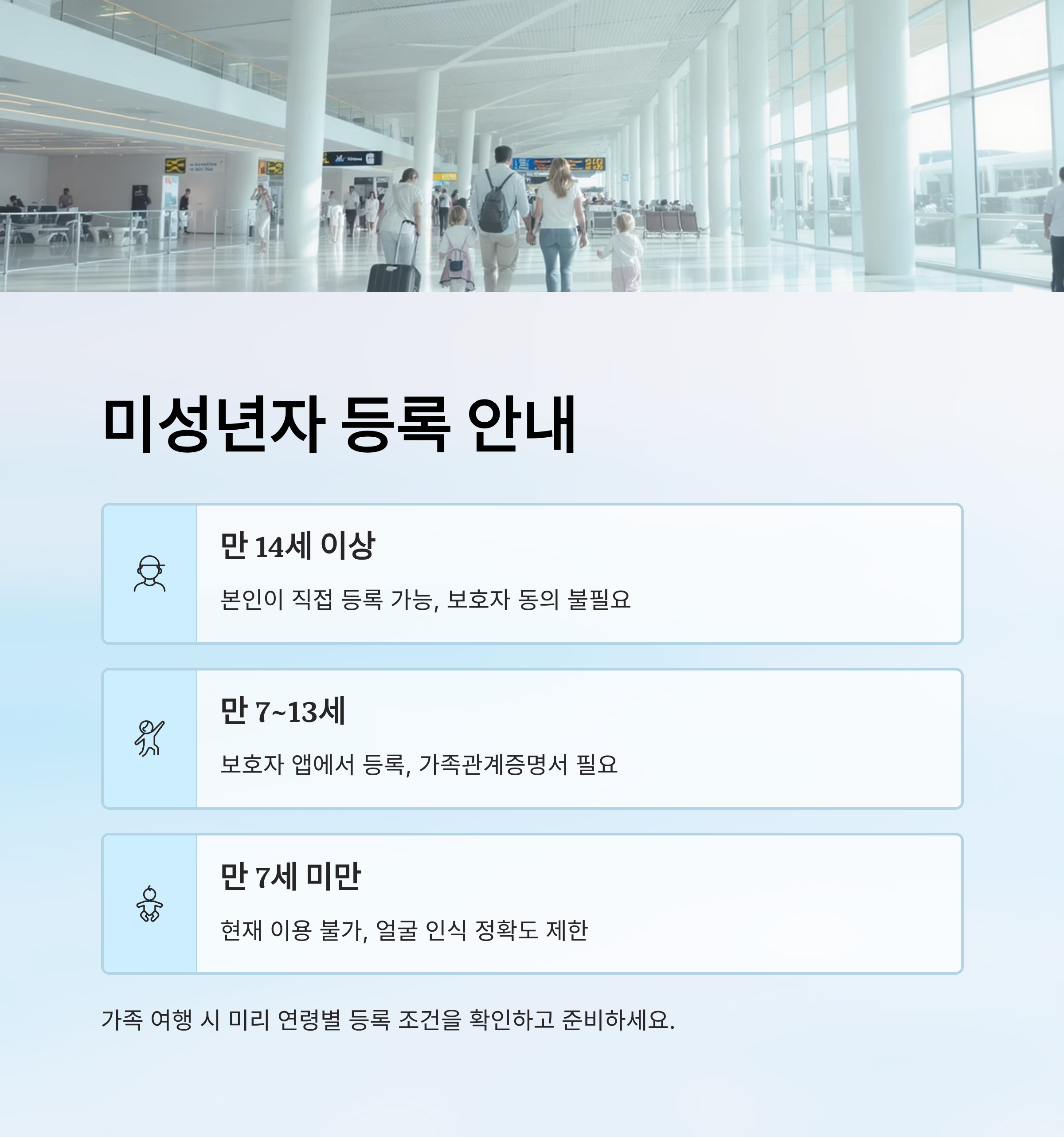 등록이 완료되면 보호자와 동일하게 스마트패스 기능을 이용할 수 있지만, 반드시 보호자가 등록 과정을 완료해야만 해요. 공항에서는 미성년자도 독립적으로 통과가 가능하니까, 가족여행 시 굉장히 편리하게 이용할 수 있어요.