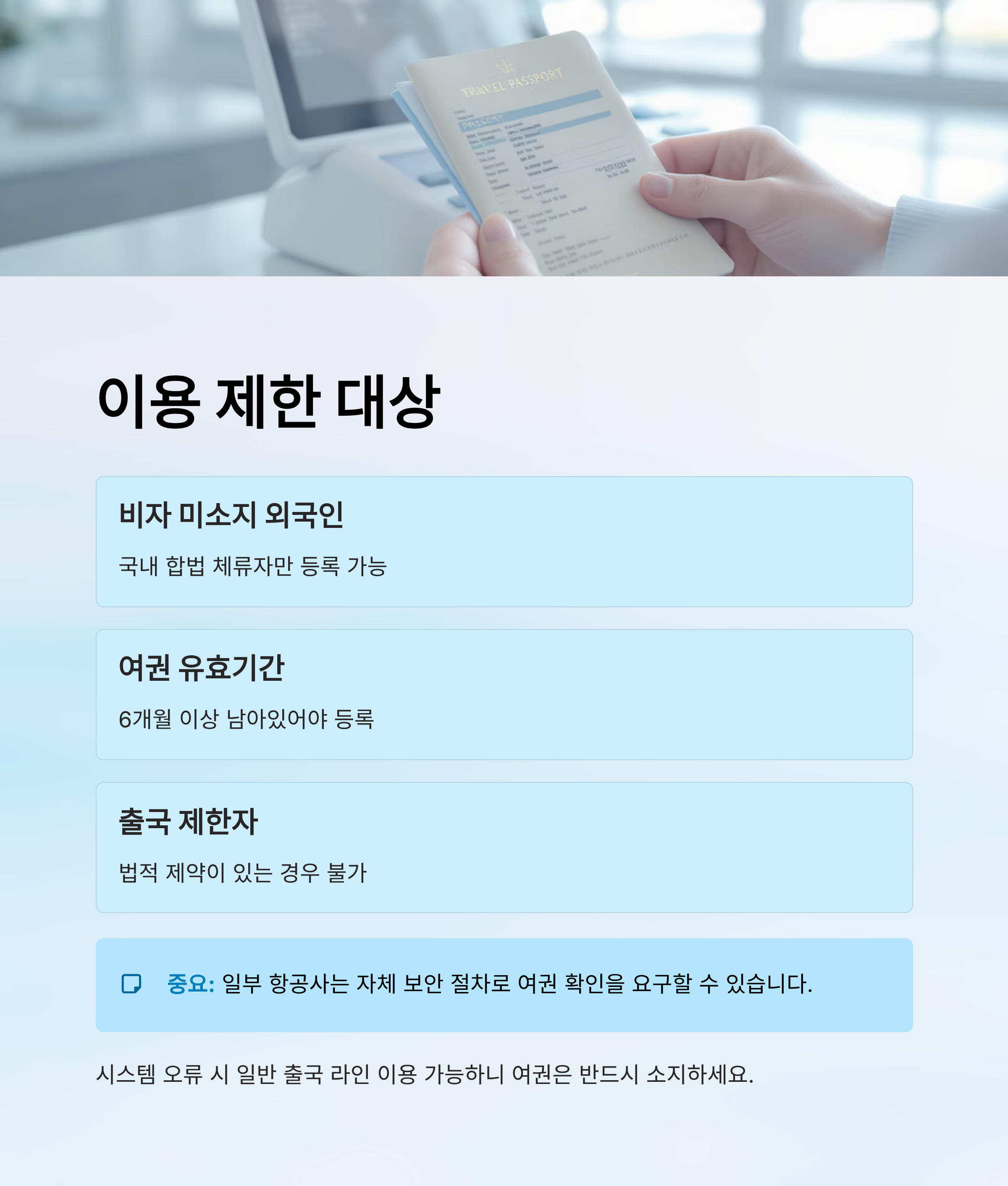 먼저 이용 대상은 만 14세 이상 내국인 및 외국인 등록증이 있는 외국인이에요. 국내에 합법적으로 체류 중이고, 유효한 전자여권을 소지하고 있어야만 해요. 여권 유효기간이 6개월 이상 남아 있어야 등록도 가능하답니다.