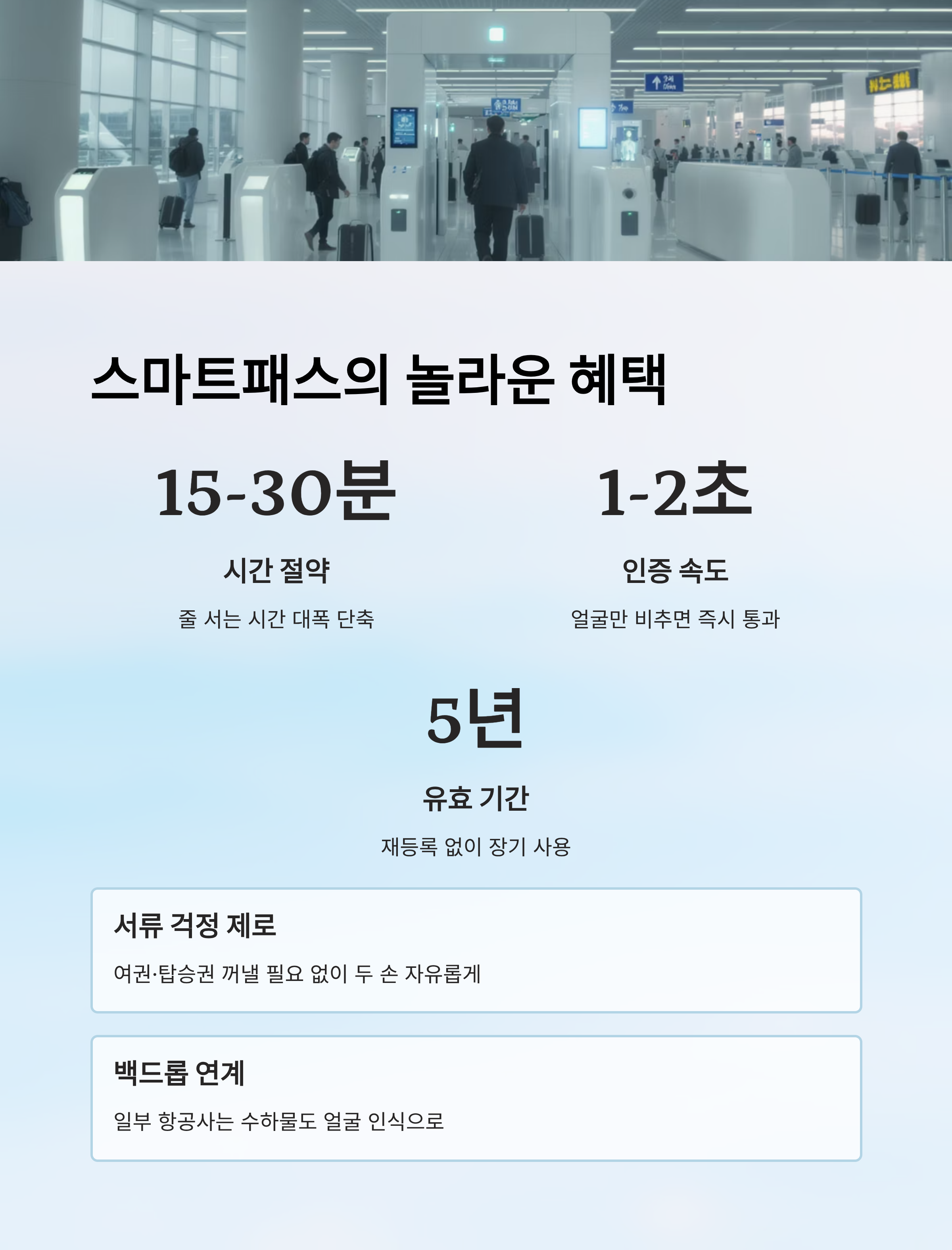 스마트패스를 이용하면 가장 큰 혜택은 바로 ‘시간 단축’이에요. 출국장 입장부터 보안검색, 탑승구 통과까지 모든 절차에서 줄을 설 필요가 없어요. 얼굴인식 하나로 신속하게 진행되기 때문에 최소 15분에서 30분 이상을 절약할 수 있어요.