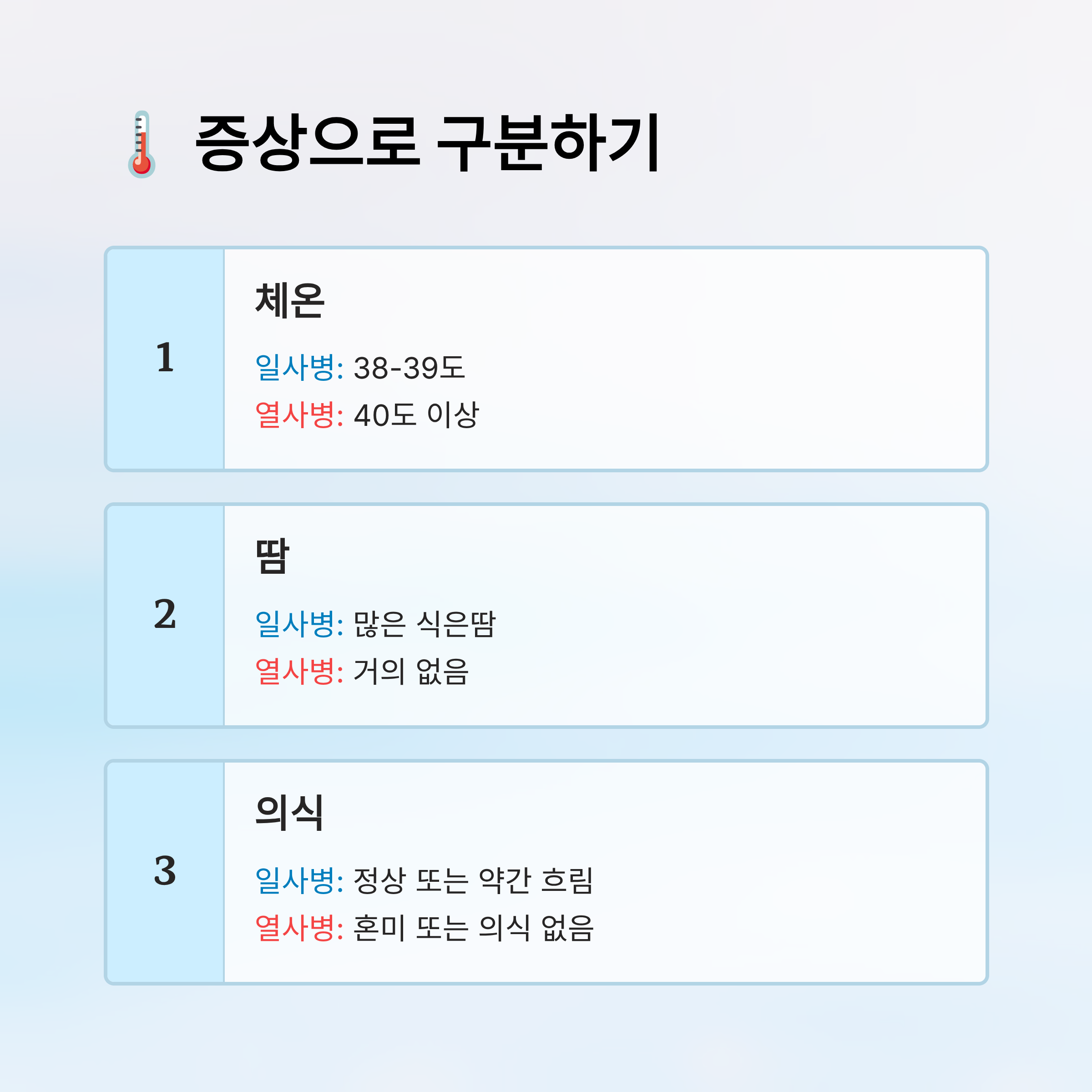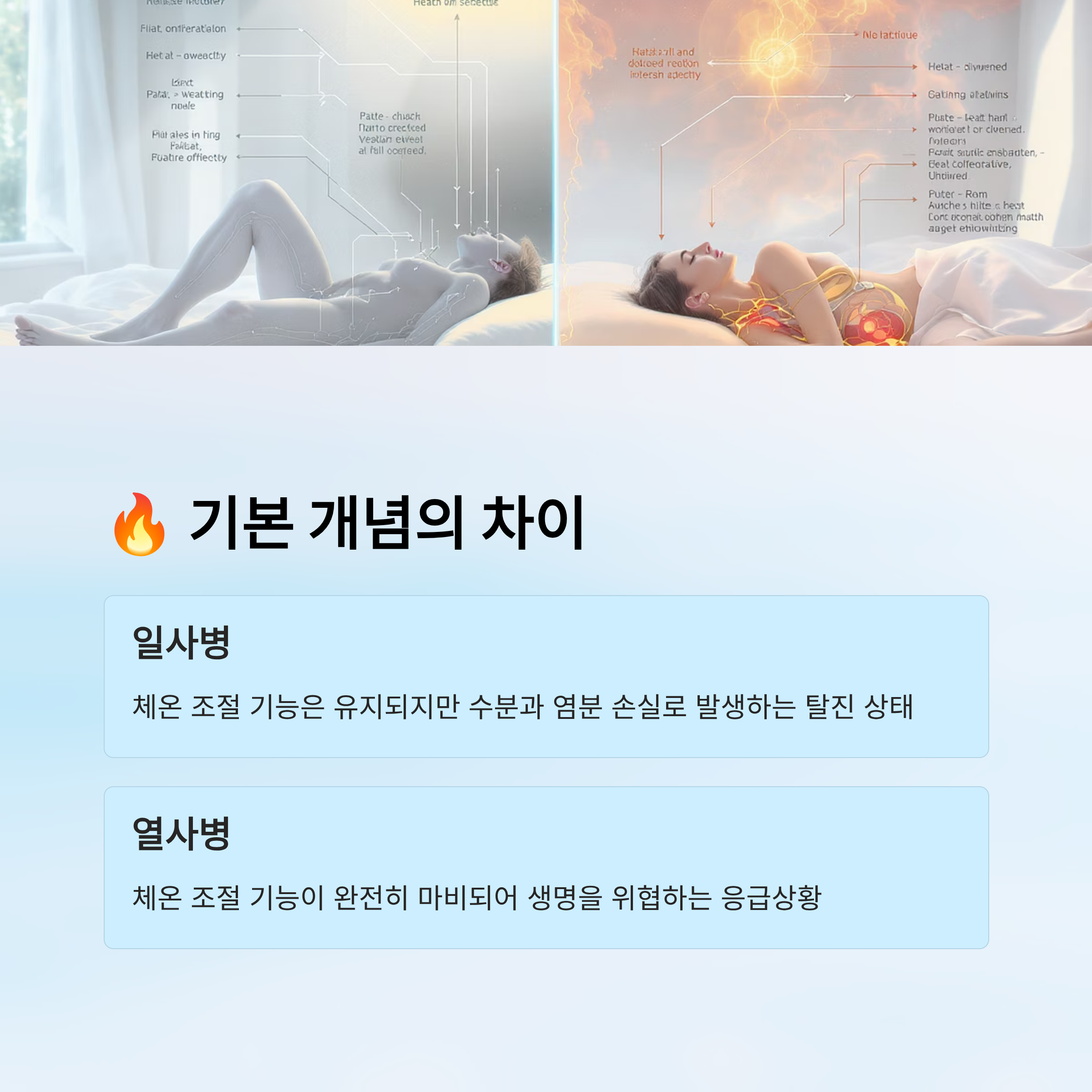 간단하게 말하면, 일사병은 "탈진 상태", 열사병은 "신체 기능 붕괴"로 이해할 수 있어요. 이름은 비슷하지만 결과는 전혀 다르니 혼동하지 않도록 주의가 필요해요.