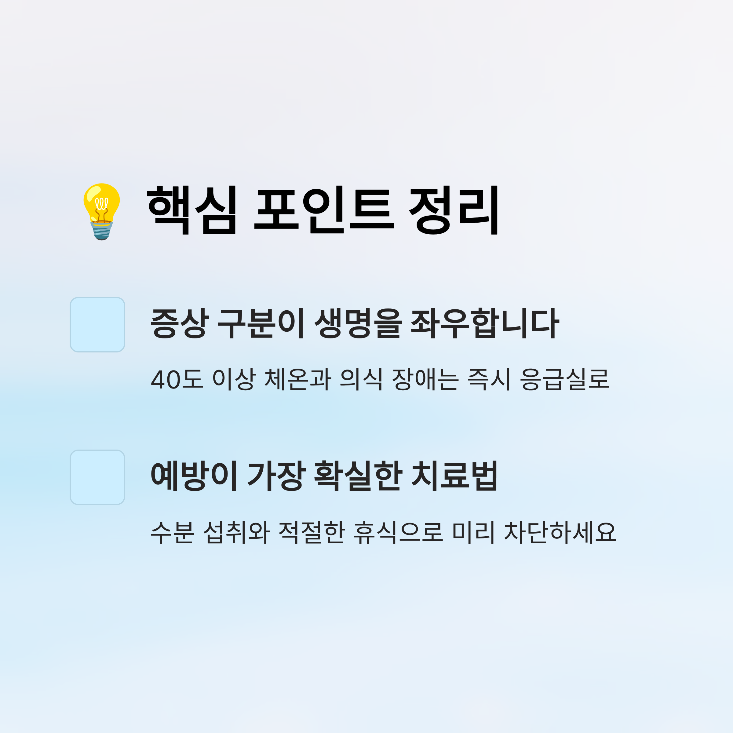 이처럼 작은 차이들이 응급처치 방향을 완전히 바꿔요. 증상만 제대로 파악해도 위험한 상황을 빠르게 인식하고 대처할 수 있답니다. 여름철엔 항상 체온과 땀, 의식 상태에 민감해야 해요. ⛑️