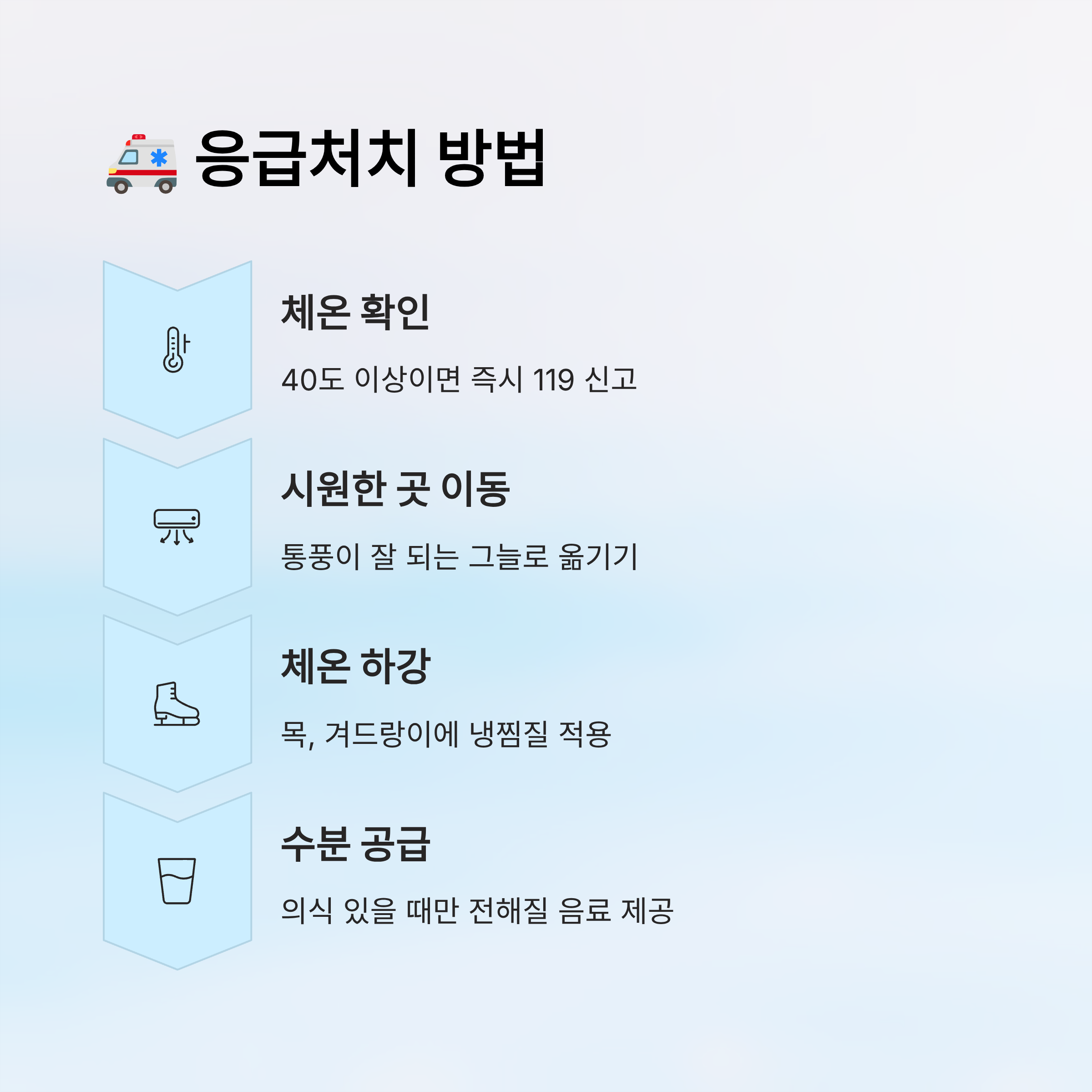 반면 열사병은 응급 상황이에요. 의식이 흐려지거나 체온이 40도를 넘는다면 즉시 119에 연락하고 병원으로 이동해야 해요. 이동 중에도 체온을 낮추는 게 중요해요. 얼음팩이나 찬물 샤워, 젖은 수건으로 몸을 감싸는 것도 도움이 돼요.