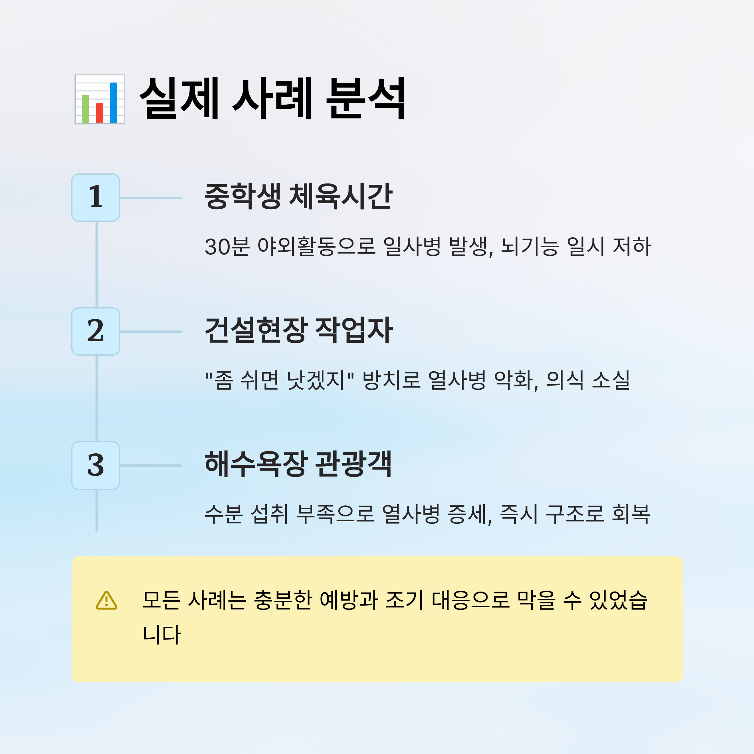 온열 질환이 얼마나 위험한지 알려주는 사례는 해마다 반복되고 있어요. 2023년 서울에서는 한 중학생이 운동장 야외체육 시간 중 일사병으로 쓰러졌고, 이후 병원에서 회복되긴 했지만 뇌 기능 저하 증상이 일시적으로 나타났어요. 단 30분의 노출이 심각한 결과를 초래할 수 있다는 사실이죠. 🏫