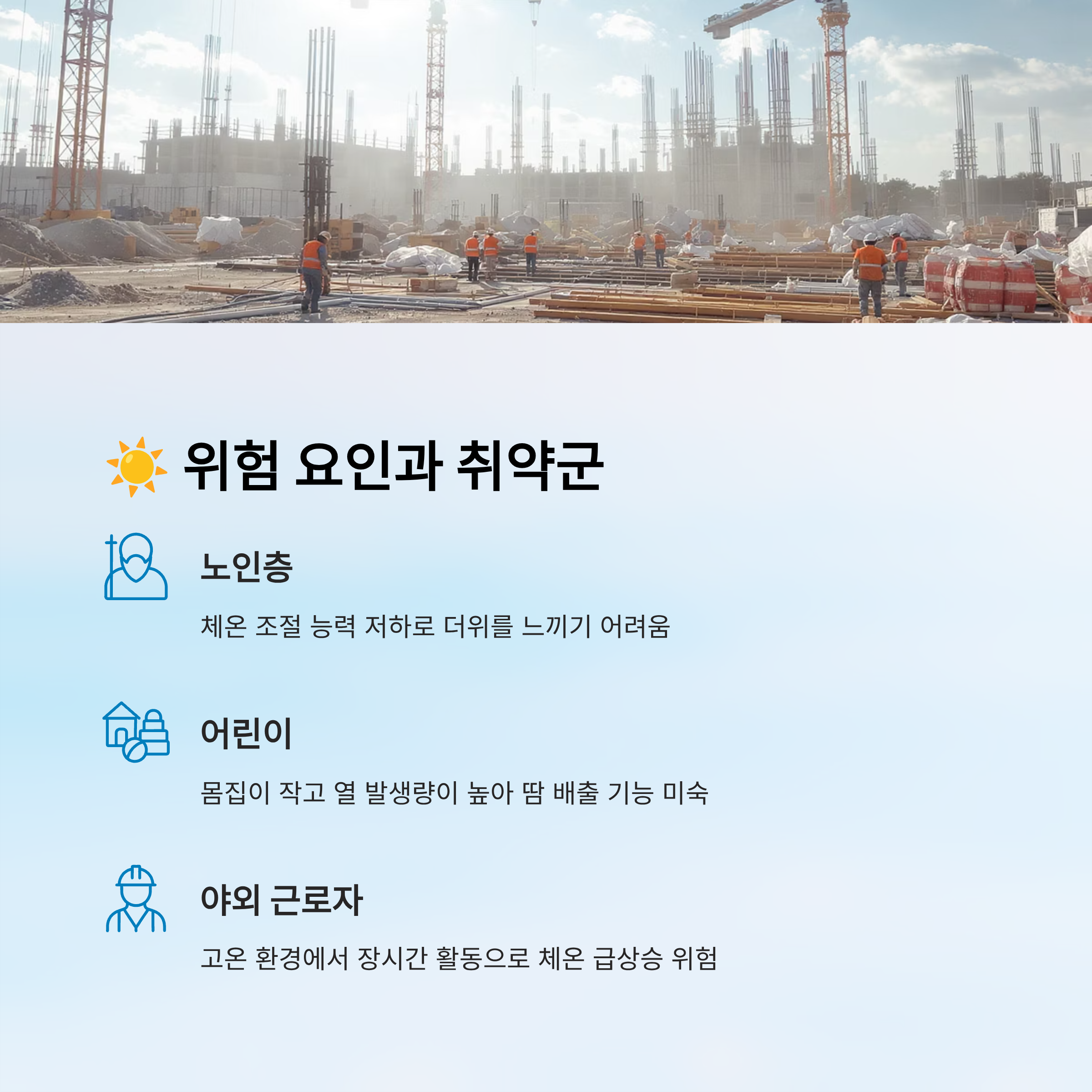 | 만성질환자 | 당뇨, 심장질환 등 보유 | 체온 조절 약화 |