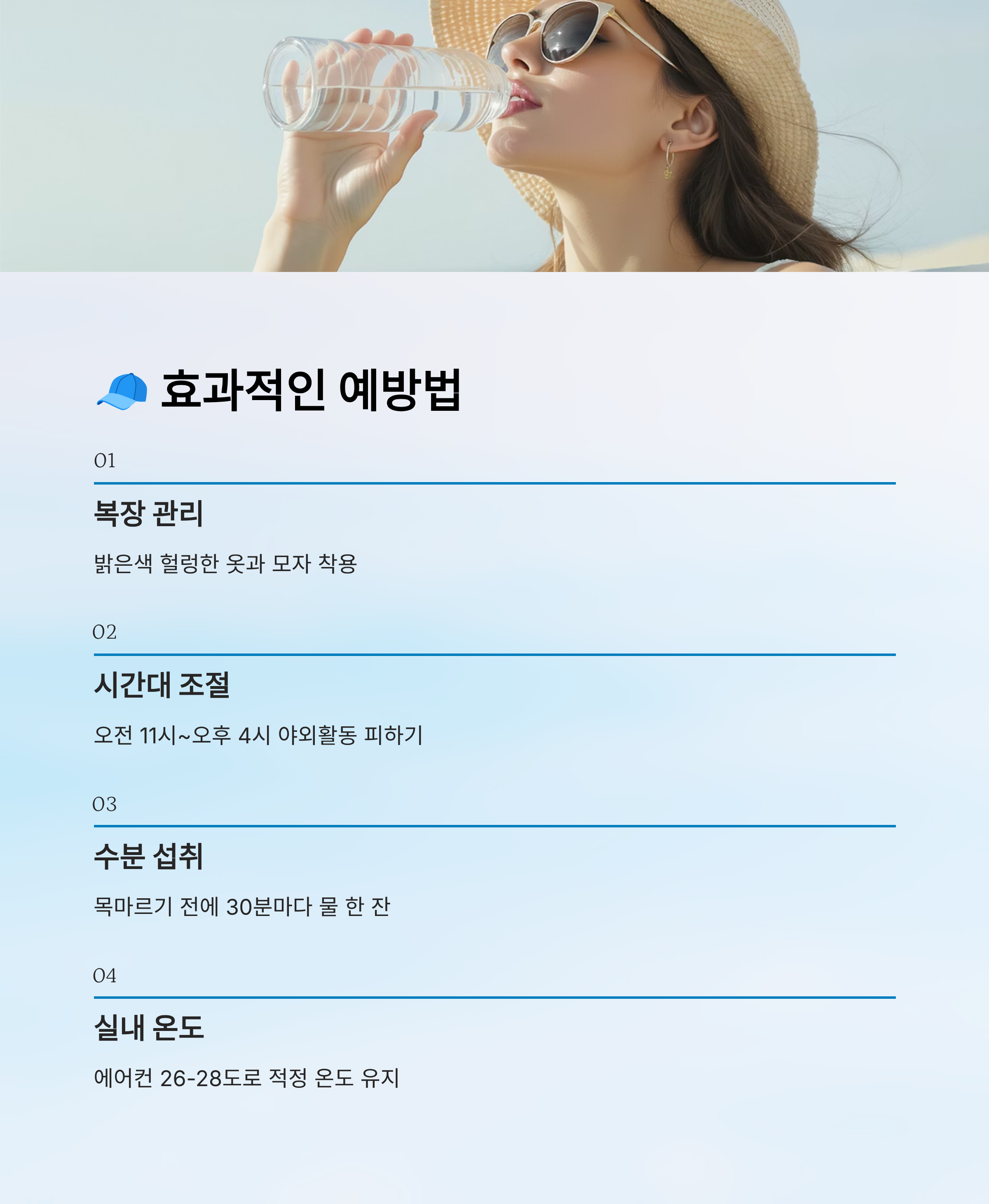 우선 외출 시에는 밝은색의 헐렁한 옷을 입고, 통풍이 잘 되는 모자나 양산을 활용하는 게 좋아요. 땀을 잘 흡수하는 소재의 옷도 체온 조절에 도움이 돼요. 야외 활동은 가급적 오전 11시에서 오후 4시 사이를 피하는 게 좋아요. 이 시간대는 태양이 가장 뜨겁거든요. 🌞