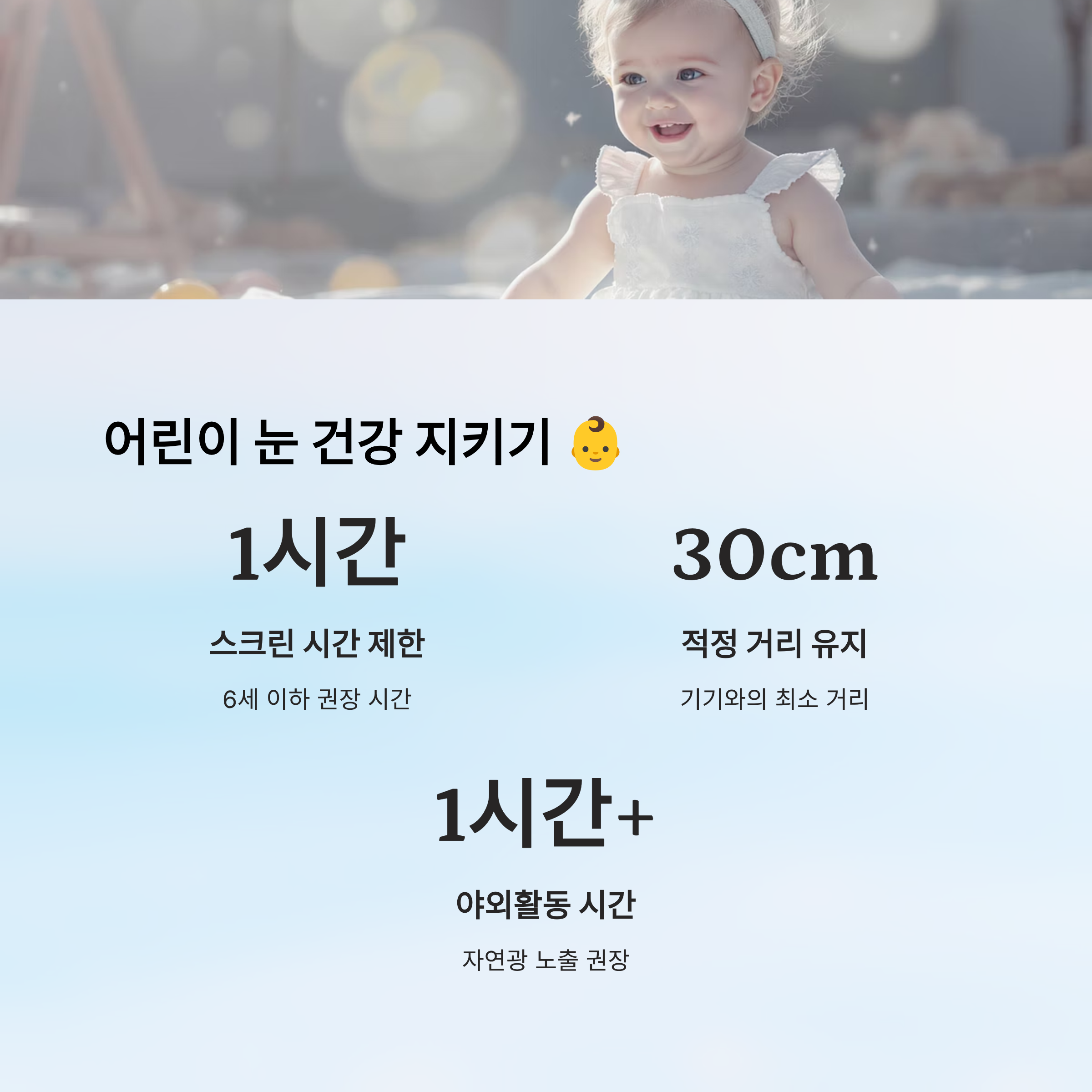 어릴수록 눈의 성장과 회복이 활발하니, 지금부터라도 습관을 잘 잡아주면 평생 눈 건강을 지킬 수 있어요. 아이의 눈을 위한 최고의 투자, 바로 지금 시작해보세요! 👶