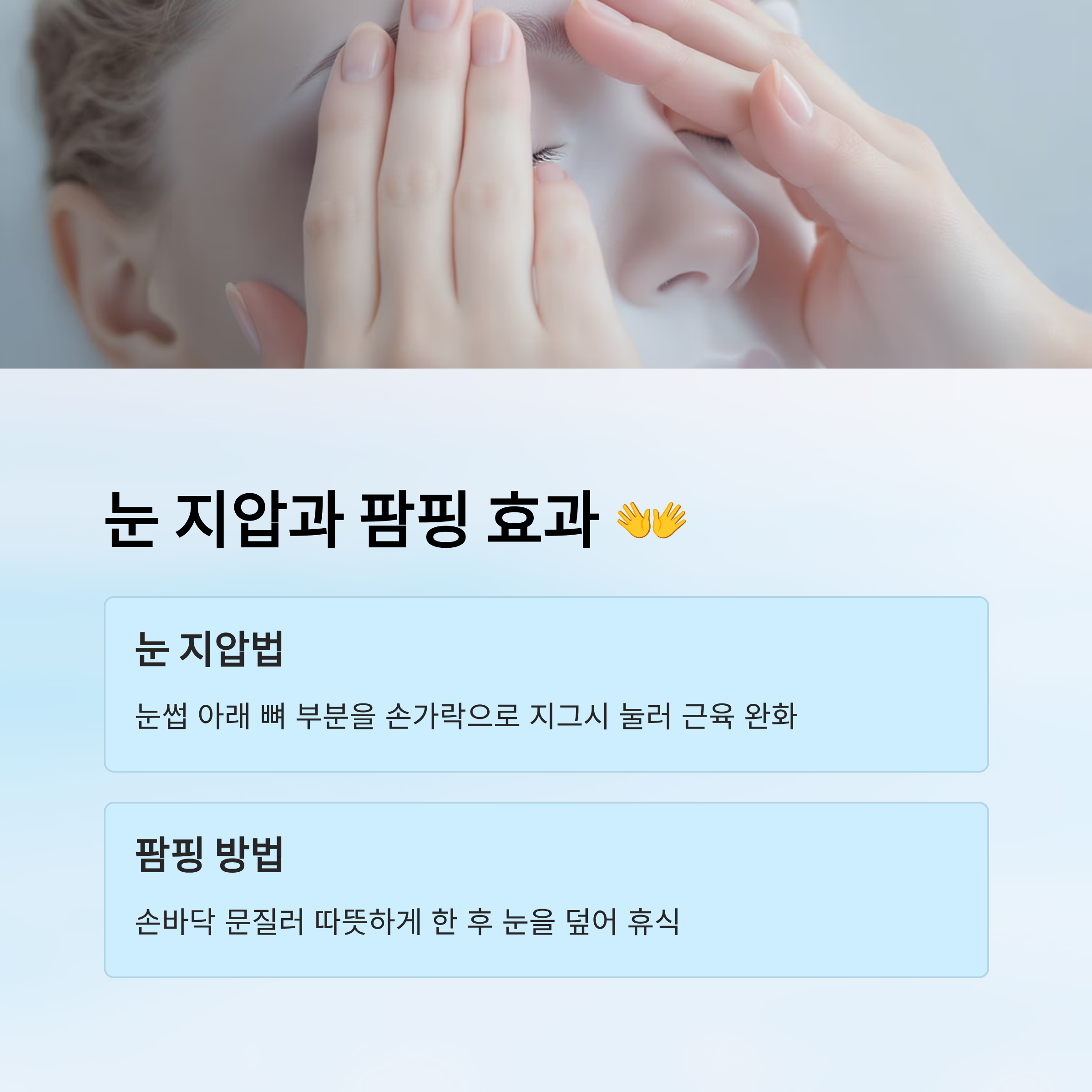 내가 생각했을 때 가장 효과적인 건 ‘눈 지압’이에요. 눈썹 아래 뼈 부분을 손가락으로 지그시 눌러주는 것만으로도 긴장된 눈 주위 근육이 완화되거든요. 그리고 눈꺼풀을 지그시 감고 양 손바닥을 덮어 따뜻하게 감싸주는 '팜핑'도 좋답니다. 이때 손을 문질러 따뜻하게 해주는 게 포인트예요.